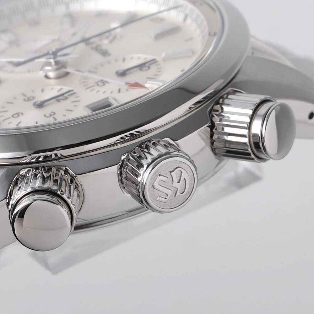 モデル情報 | スプリングドライブムーブメント搭載のクロノグラフモデルです。柔らかな色味の文字盤は光の強さや角度によって微妙にその色合いが変化します。マスターショップのみで取り扱われる限定モデルで、クロノグラフ機能に加え24時間表示針も備えています。パワーリザーブ72時間。 |