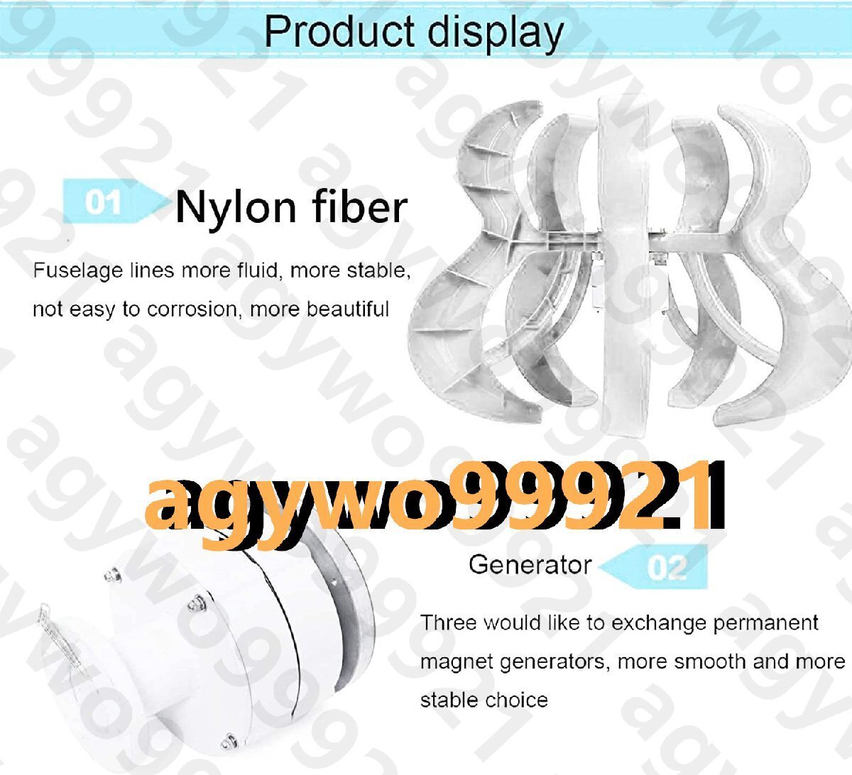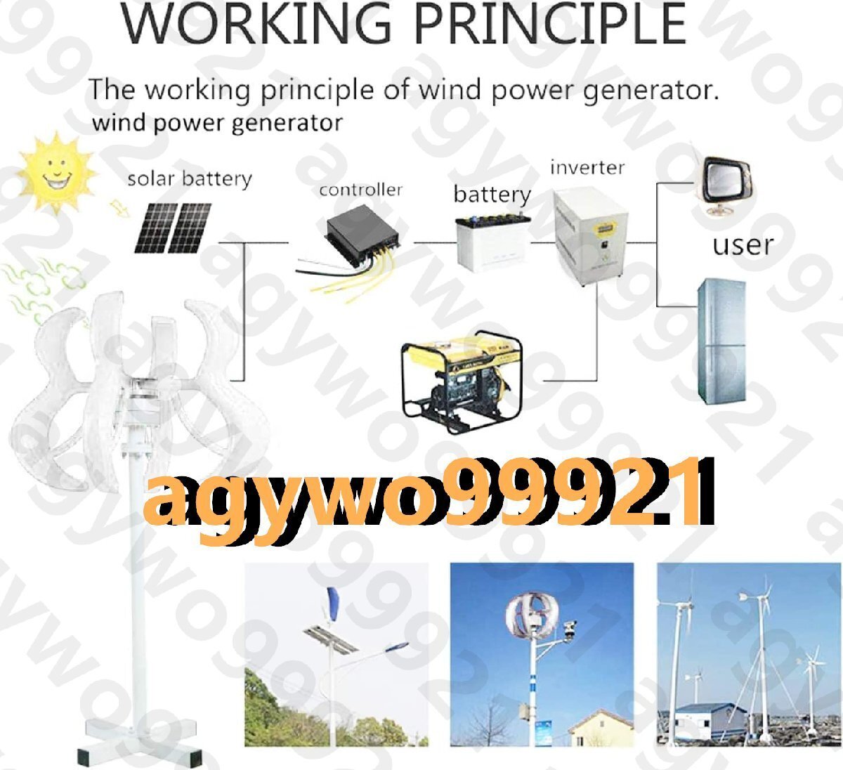 特徴:-太陽のない夜と雨の日には風力発電が発生し、晴れた日には太陽光発電が発生します。-これは緑の風車や家庭に理想的な風力タービンですエネルギーサプリメント。ボート、パビリオン、キャビン、監視用途などに適しています。 含まれるパッケージ:1x垂直風力タービン発電機1x充電コントローラー ジェネレーター:Maglevジェネレーター 速度調整:風が自動的にエングルします 過速度保護:電磁ブレーキ 機能:低振動、低い開始風速 仕様コントローラーシステム:電磁気 開始風速:1.3 m / sカットイン風速度:2.5 m / s 定格風速:11 m / s 最大風速:?40m/ s瞬間最大風速?45m/s ブレードのローター直径:0.54m エネレーター保護グレード:IP65 作業環境温度:-25?+ 45℃