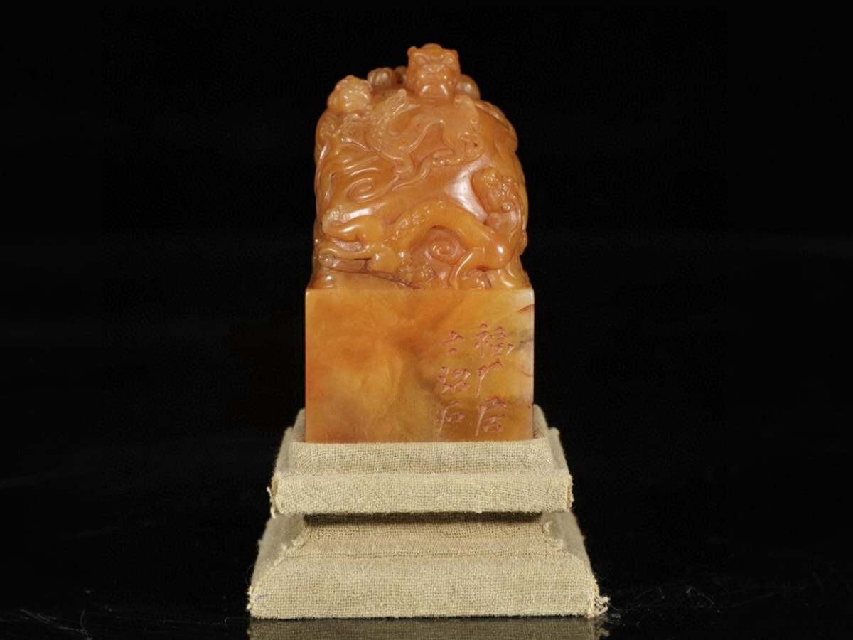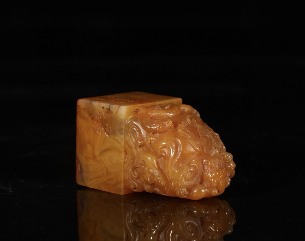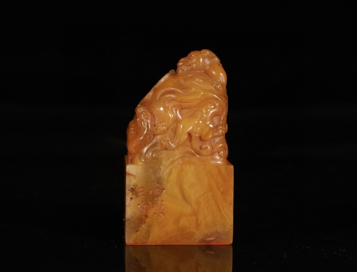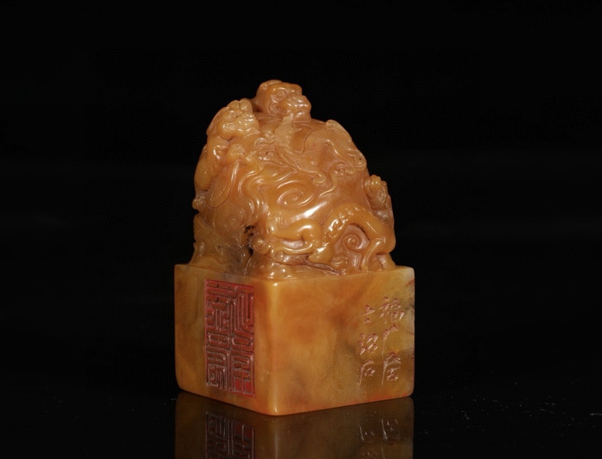 「清 福厂居士治石 老寿山石 田黄石彫り 群魑龍紋 印章 印鑑」極細工 擺件 古賞物 中国古美術 旧蔵出