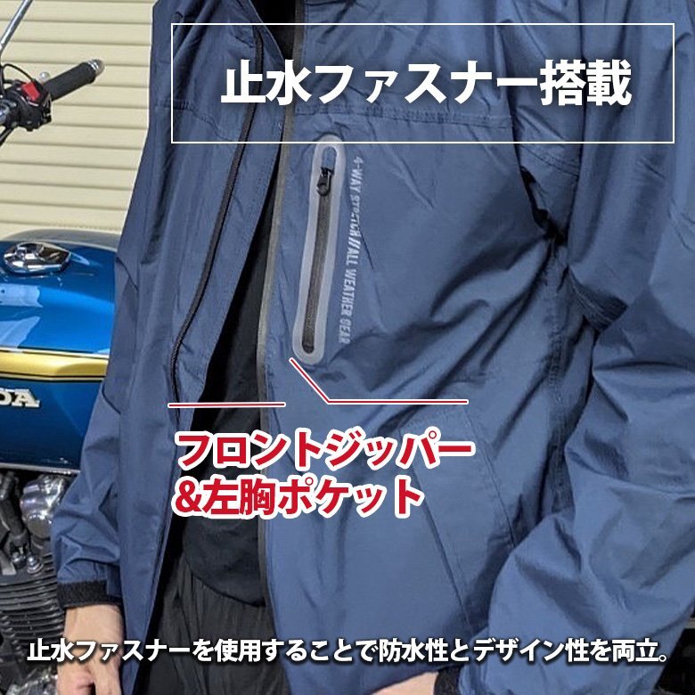 フロントジッパーと左胸ポケットは止水ファスナー仕様。防水性とデザイン性を両立しています。また、フロントジッパーには雨の侵入を防ぐ下前たても設置。防水性をさらに高めます。