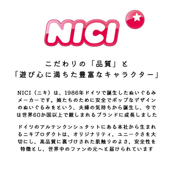 商品説明 | ・ドイツで誕生したぬいぐるみメーカー、NICI(ニキ)の遊び心に満ちたポップなぬいぐるみポーチ! ・様々な動物をかたどった、ぬいぐるみのように可愛らしいフィギュアポーチ。気持ちの良い肌触りに癒される♪ ・動物たちの背中のファスナー内側が収納スペースになったユニークなつくり。小物がたっぷり入るので、ペンケースやコスメポーチにぴったり。 ・動物やぬいぐるみが好きな方、お子さまから大人まで、様々な方にお使いいただける優しいデザインが魅力。 ・キュートなアニマルたちを種類豊富にラインナップ。お気に入りのキャラクターを身近に置いて毎日のモチベーションをアップに♪ |