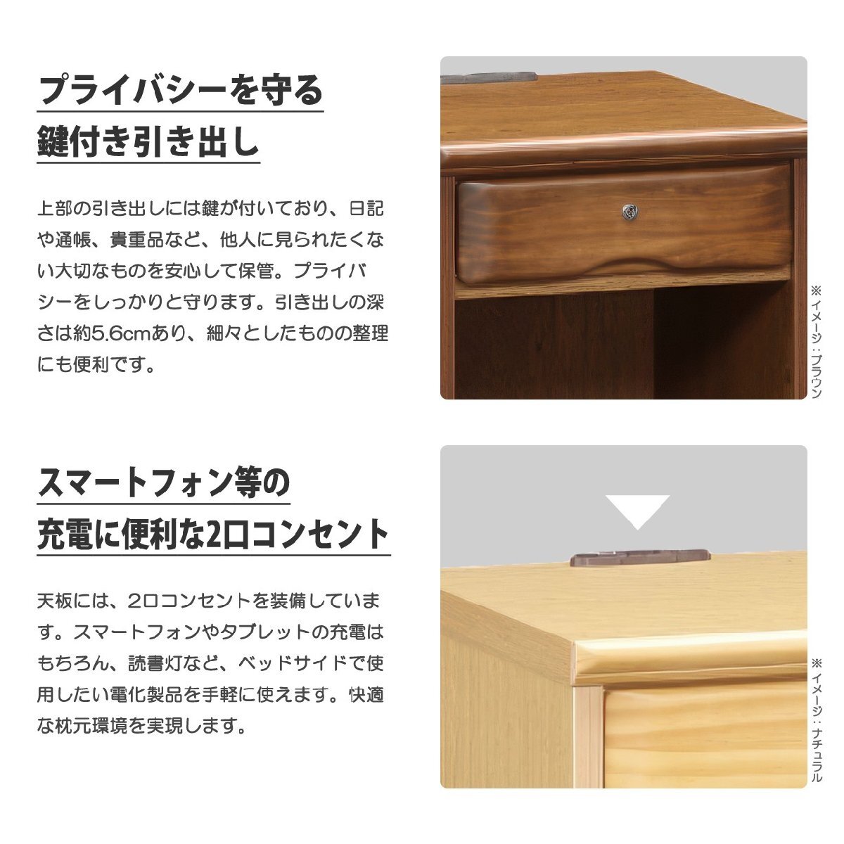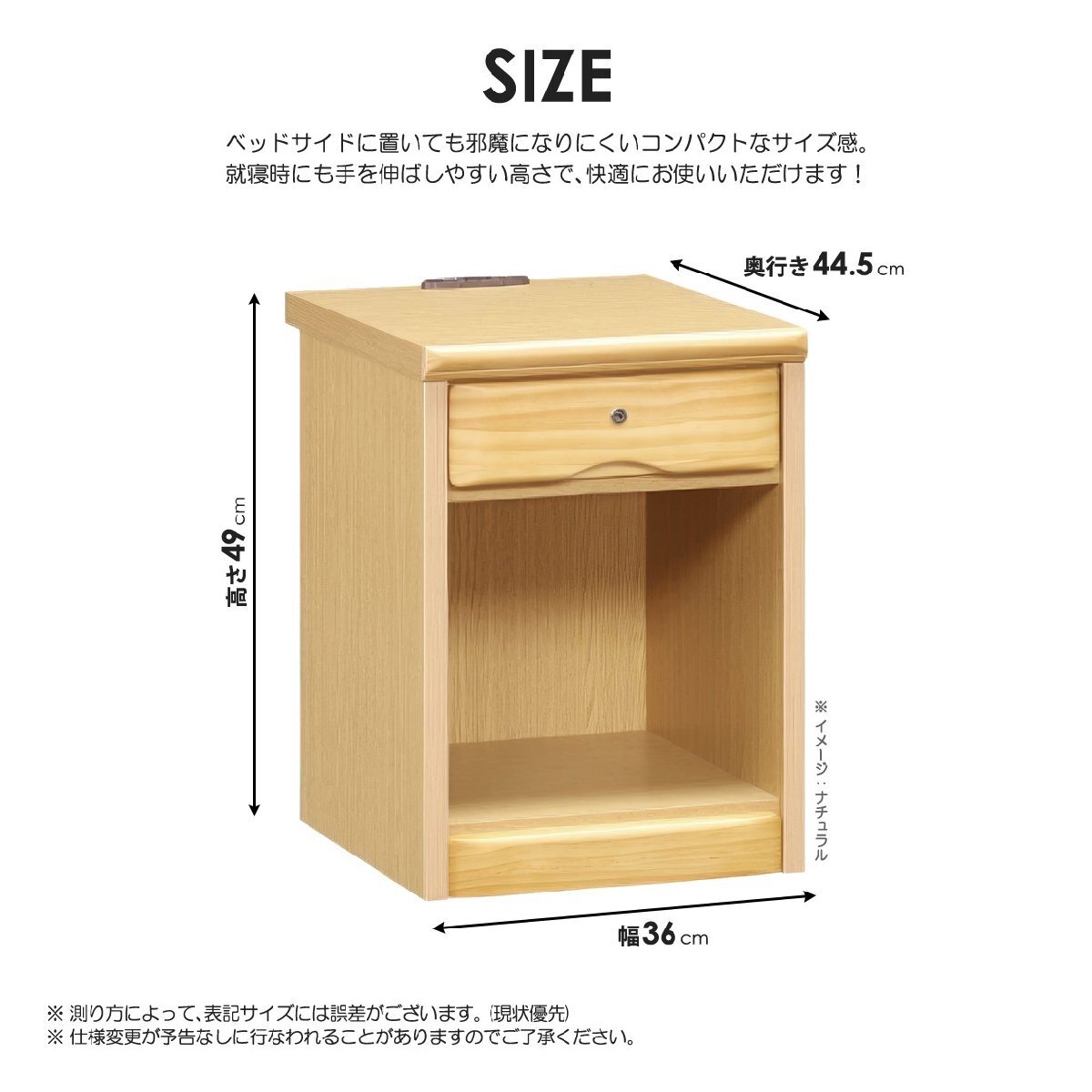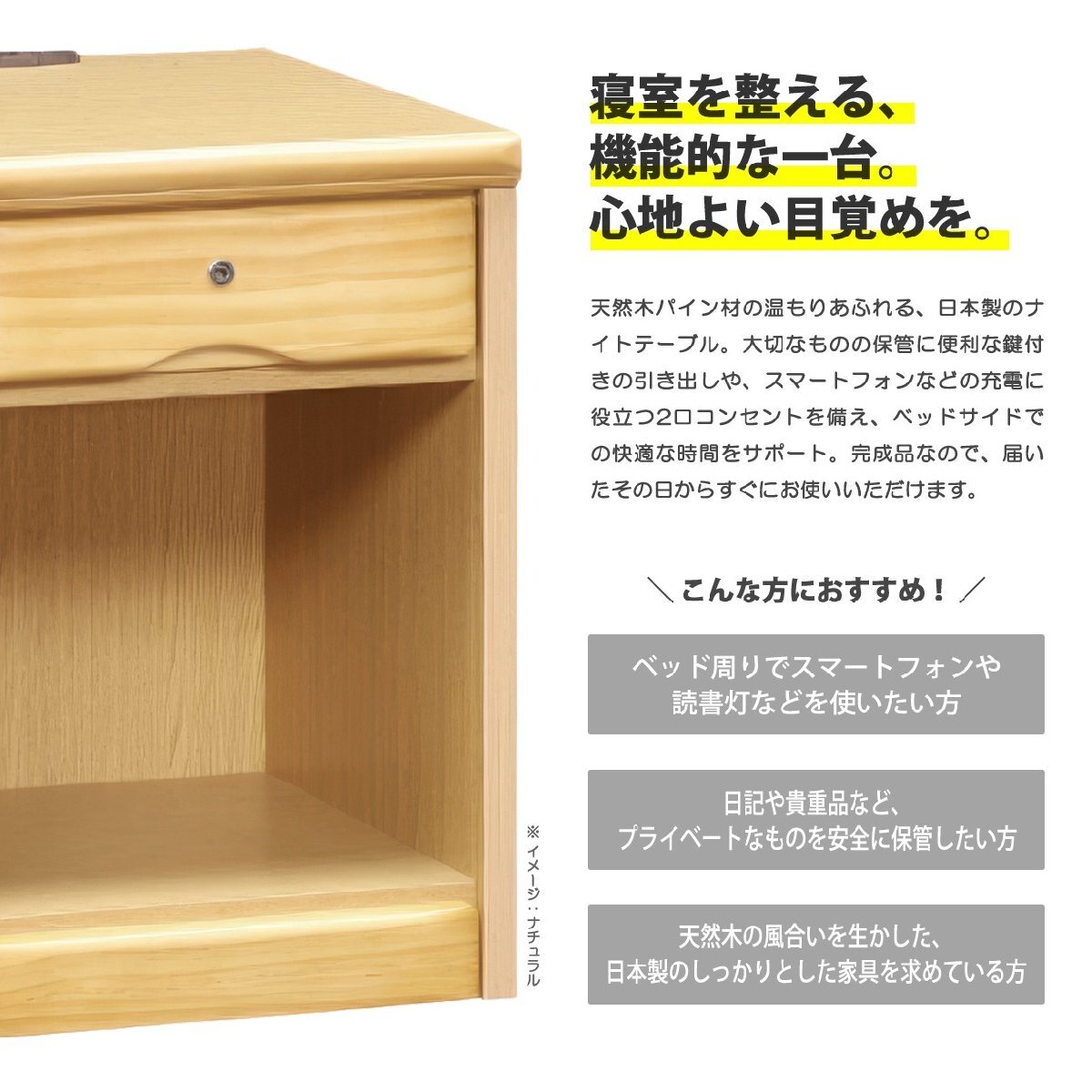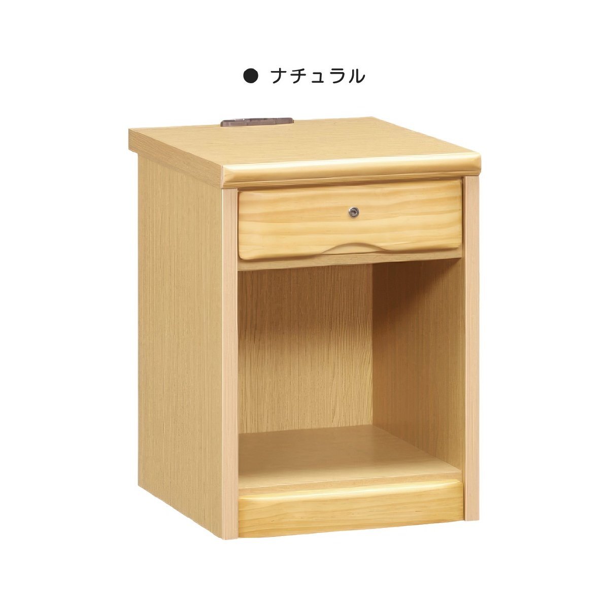 ナイトテーブル 幅36cm 天然木 パイン材 鍵付き 引き出し 2口コンセント付き オープン収納 完成品 ナチュラル