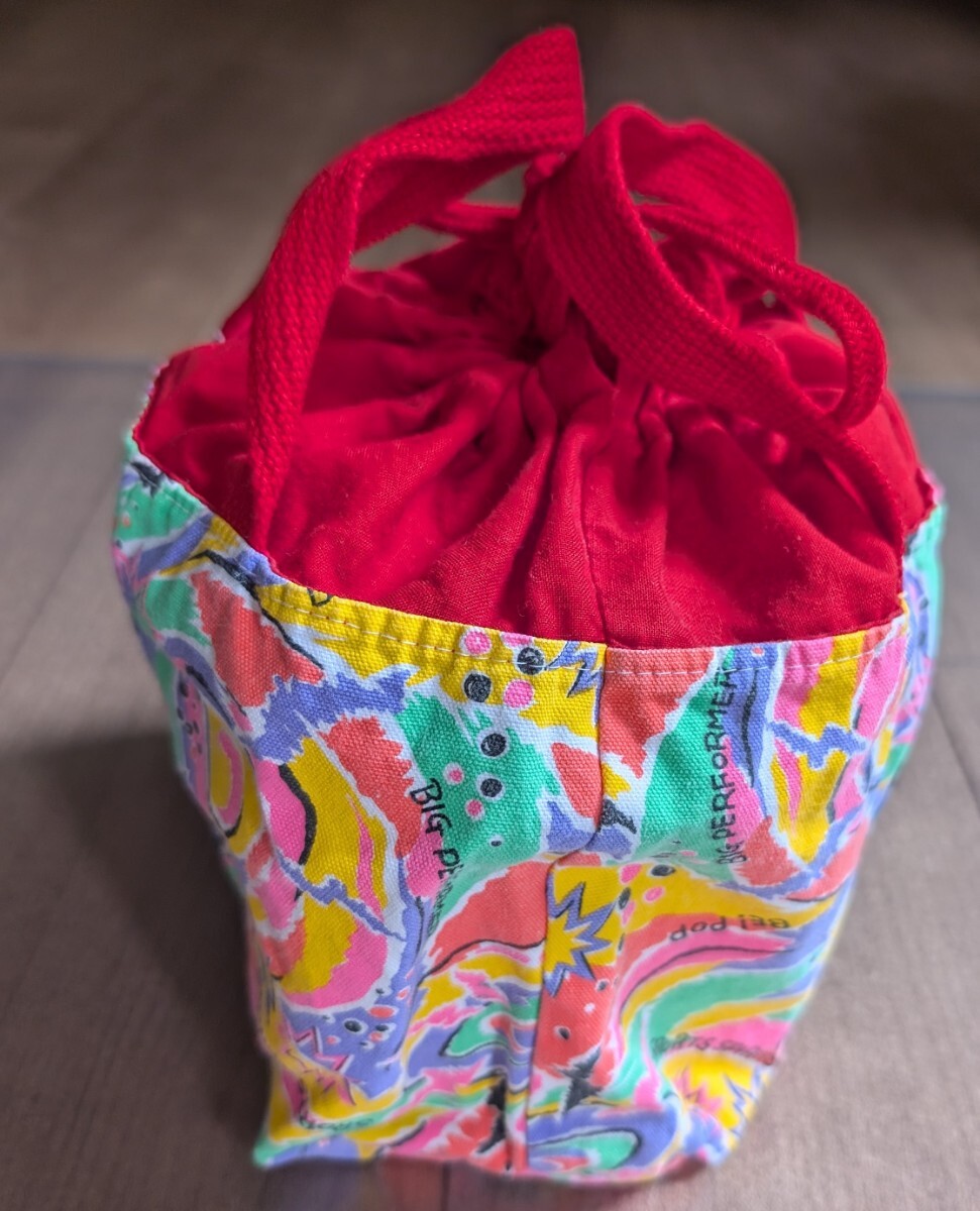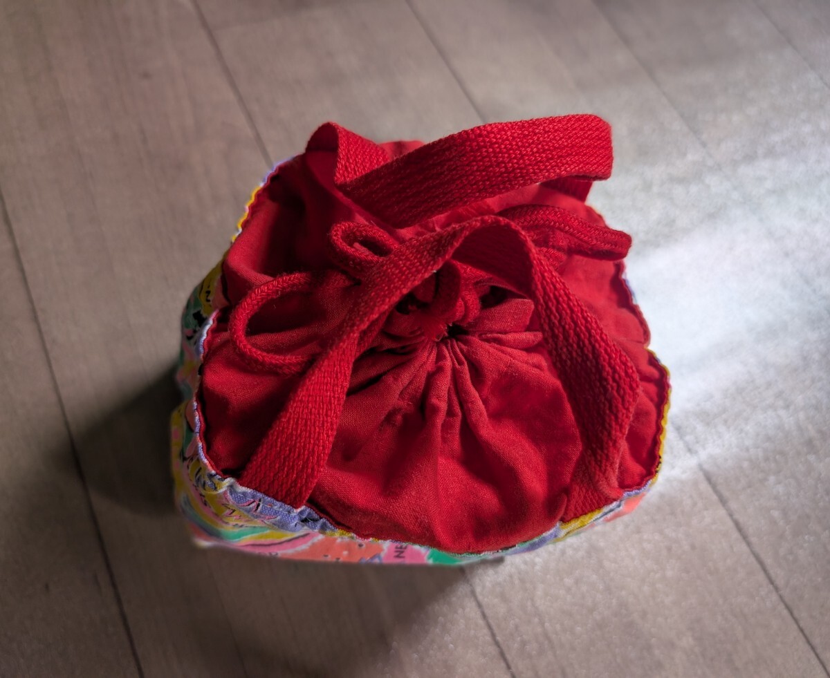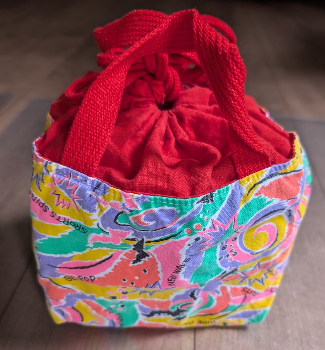 赤地にカラフルな柄が可愛らしいお弁当袋です。