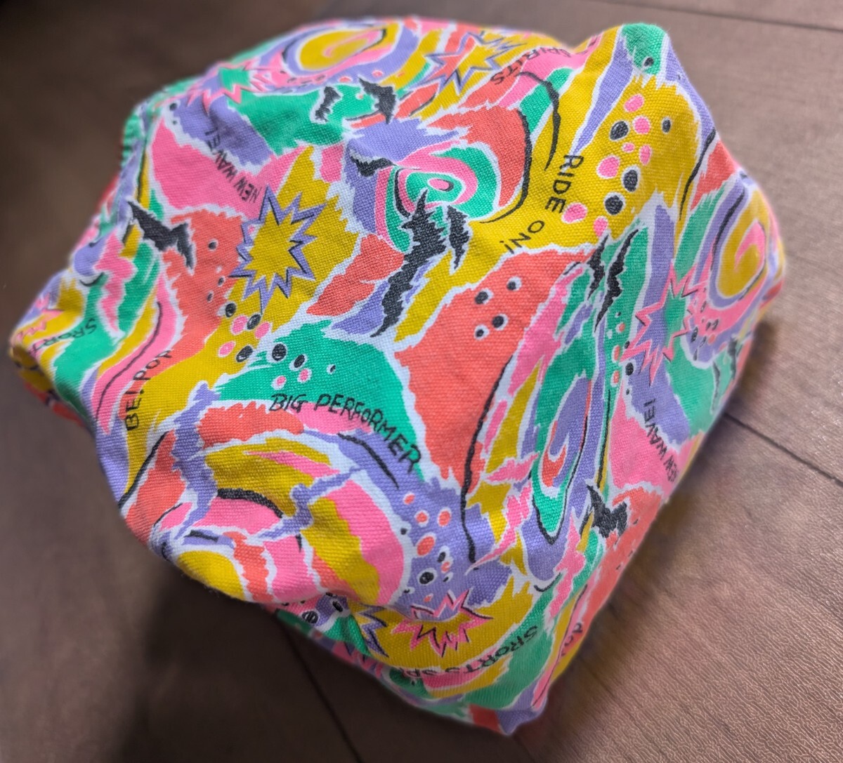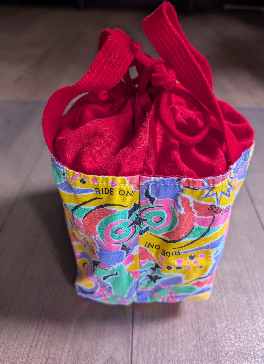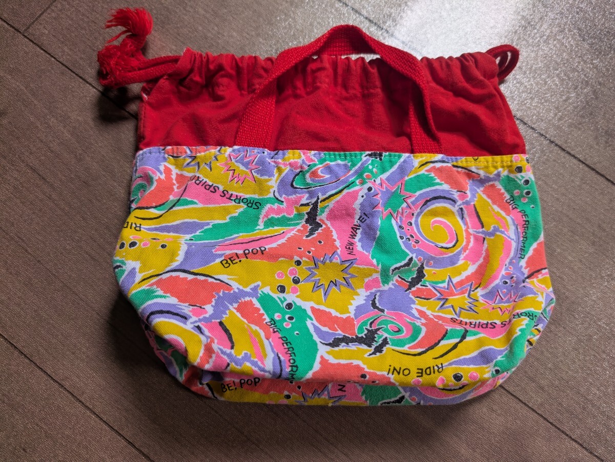 赤地にカラフルな柄が可愛らしいお弁当袋です。