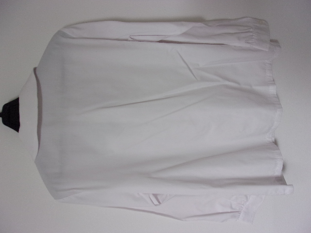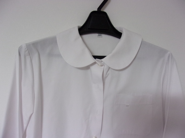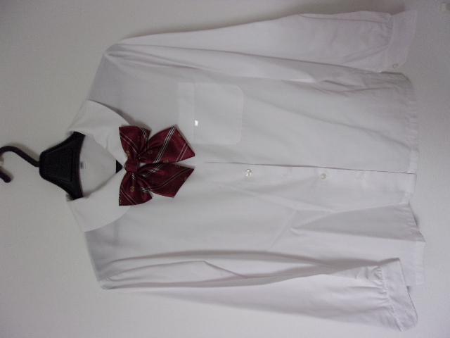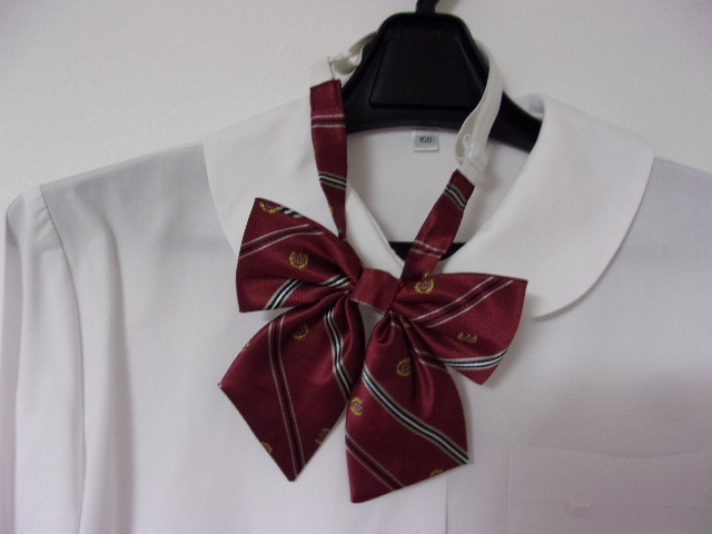 ブラウスは丸襟タイプで、付け外しのできるリボンタイ(えんじ色)がついています。