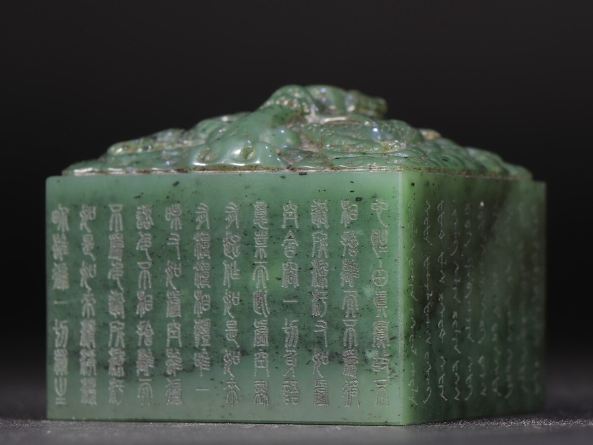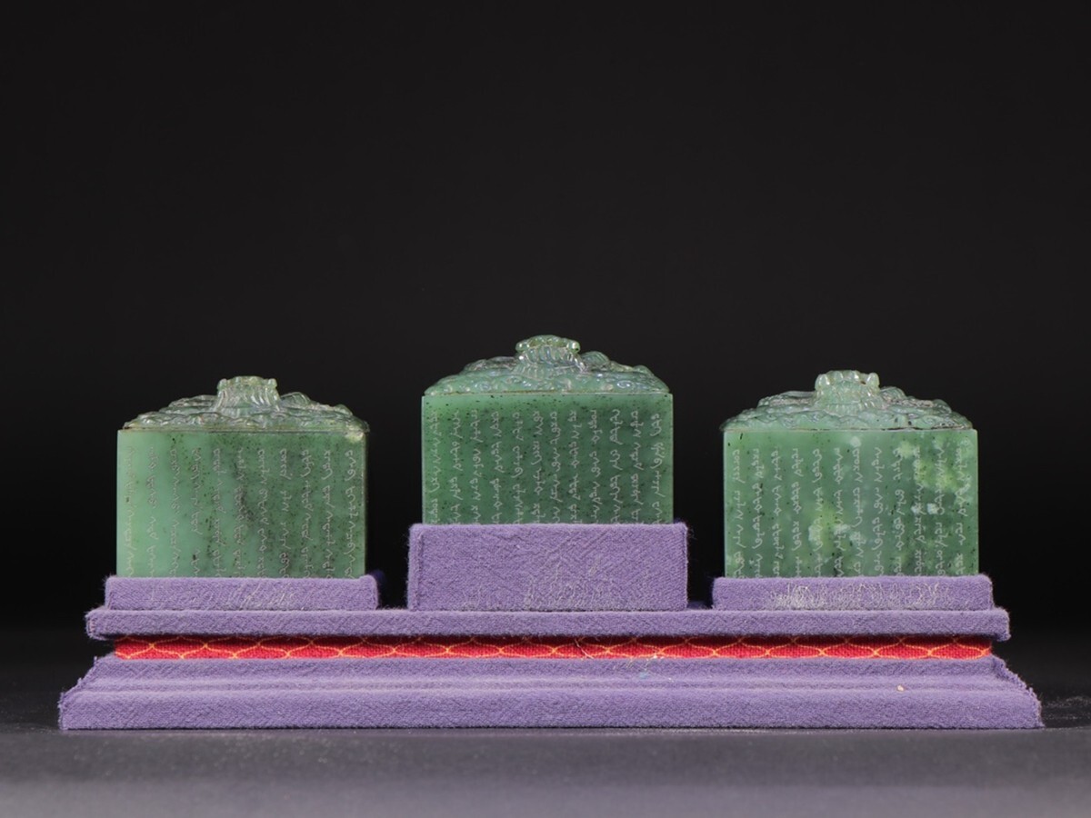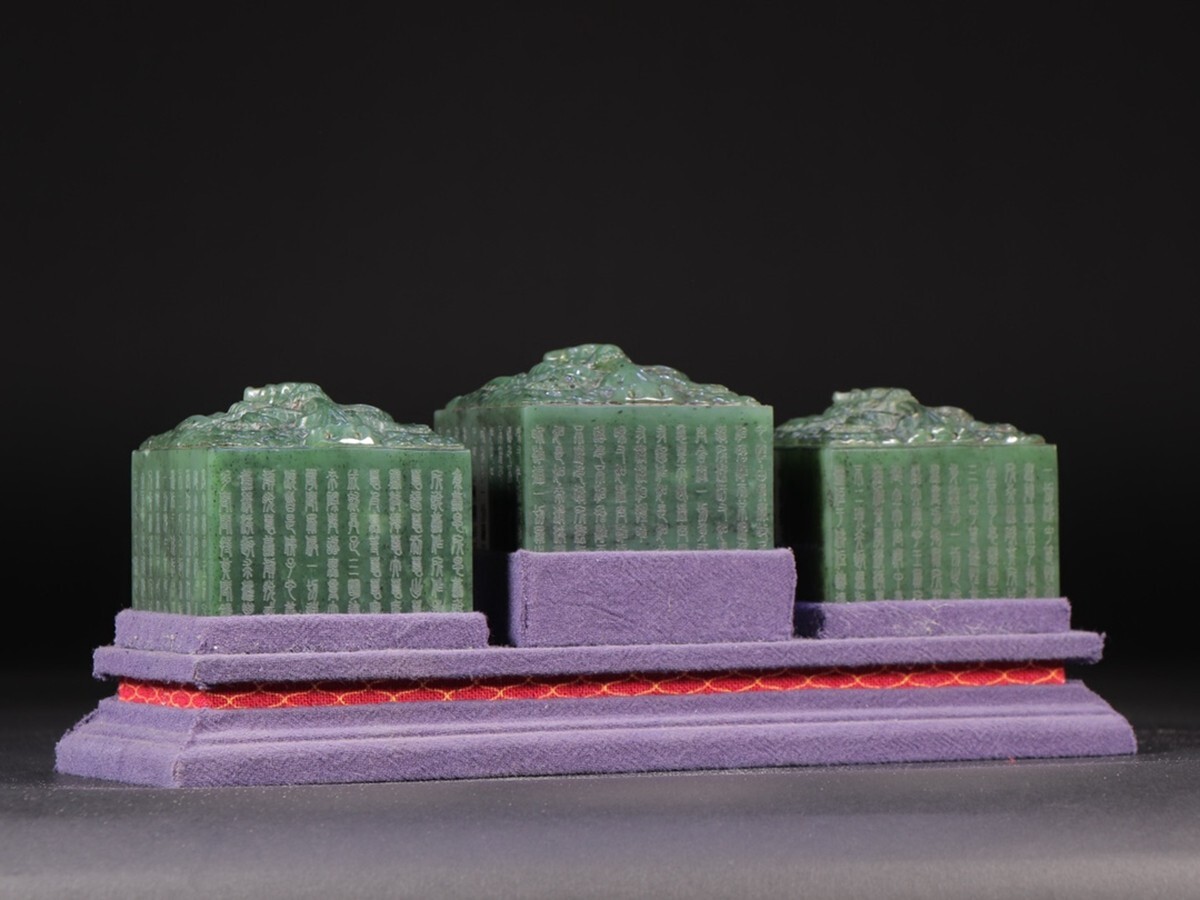 「清時代 和田玉 碧玉彫り 龍吐珠鈕詩文印章 3枚」極細工 擺件 中国古賞物 古美術 旧蔵出