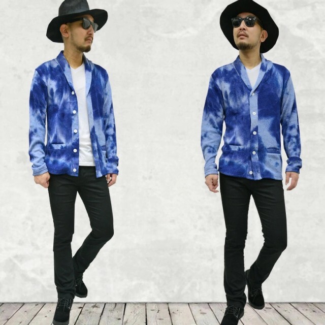 ■絞り染め技法により大胆なムラ感を表現したニット素材のショールカラーカーディガン!