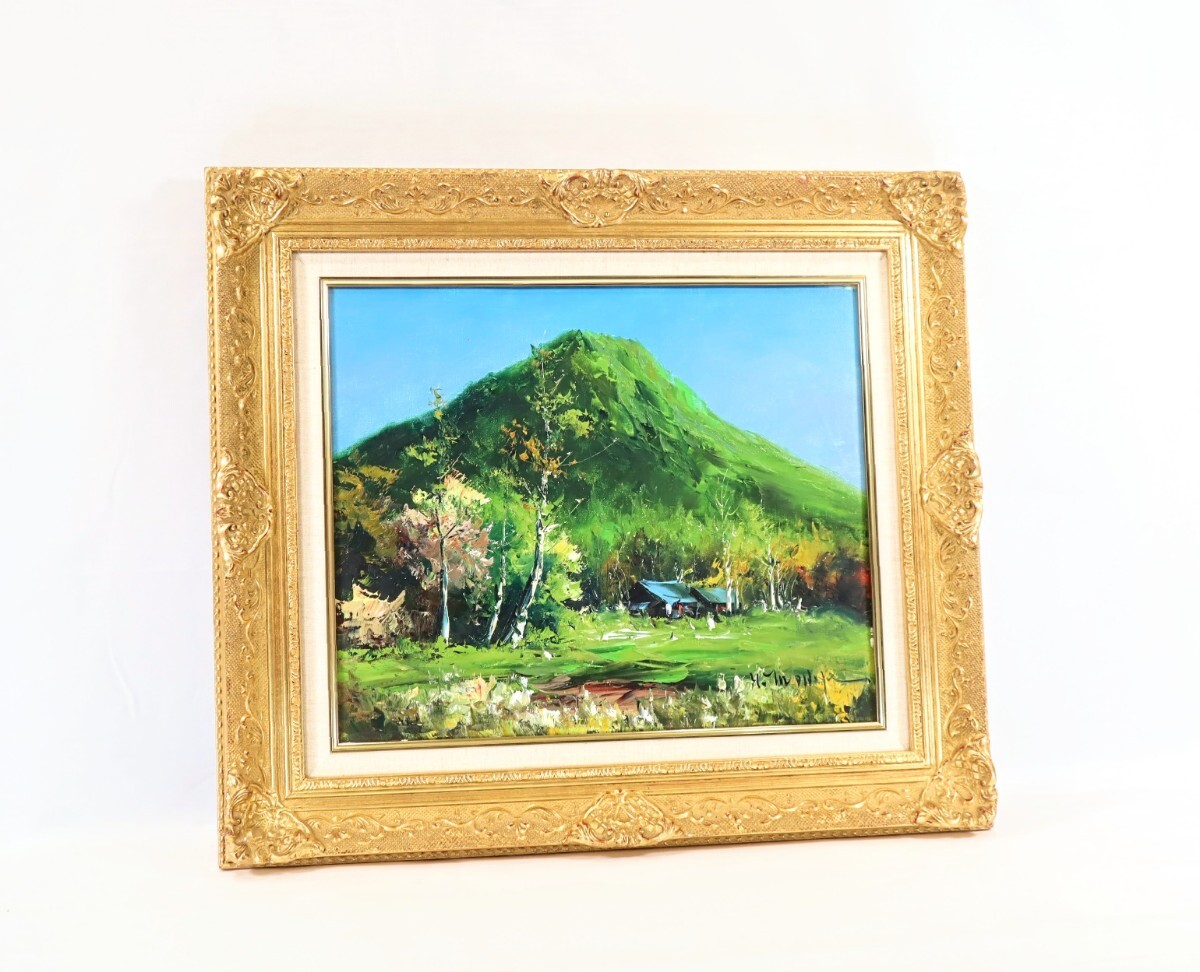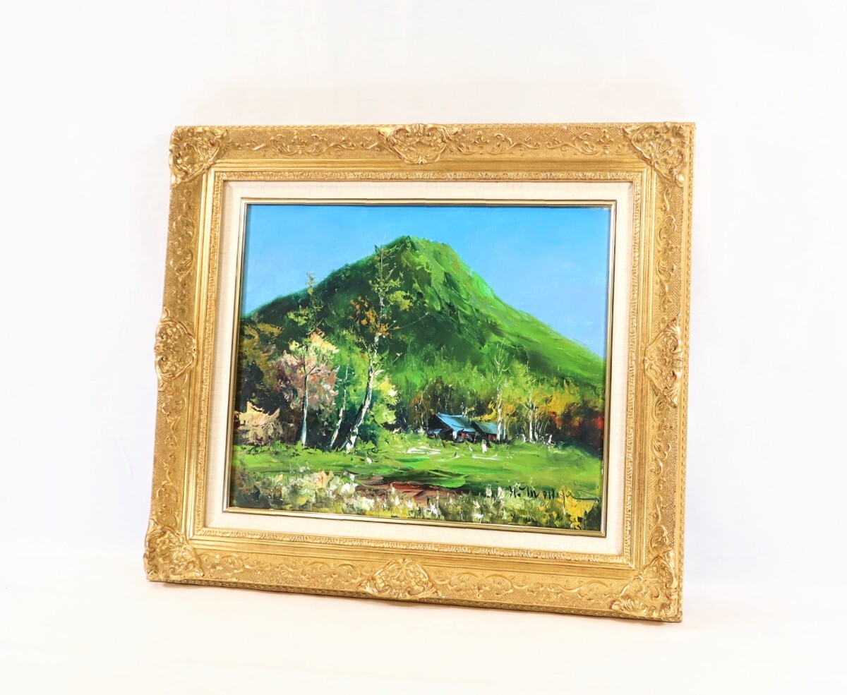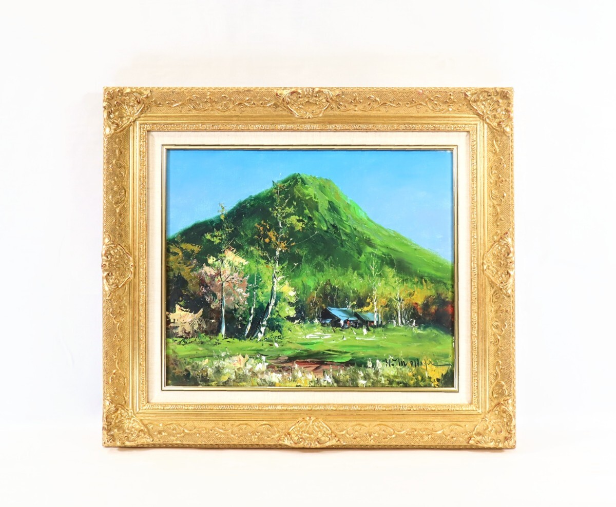 真作 森田秀和 油彩「戦場ヶ原」画寸 F8 広島県出身 彩波会所属 快晴に圧倒的な存在感、鮮烈な黄緑で覆われた堂々たる男体山の雄姿 10920