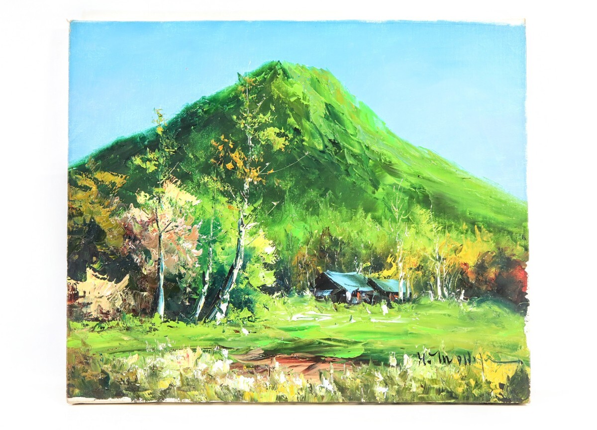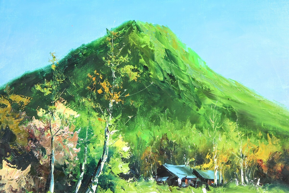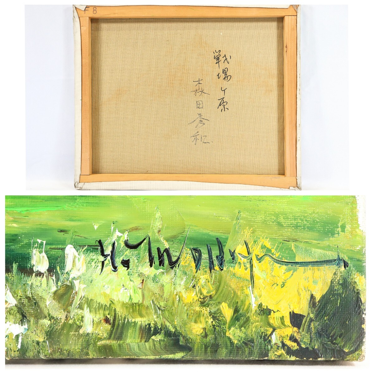 真作 森田秀和 油彩「戦場ヶ原」画寸 F8 広島県出身 彩波会所属 快晴に圧倒的な存在感、鮮烈な黄緑で覆われた堂々たる男体山の雄姿 10920