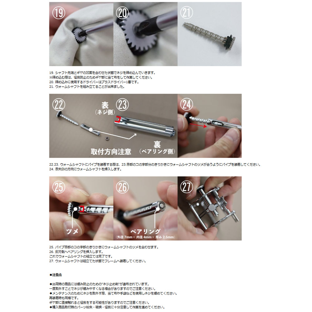 ウォームシャフトのフレームへの取付方法はHEDGEHOG STUDIO公式HPかAvail公式HPの動画を参考に作業を進めてください。