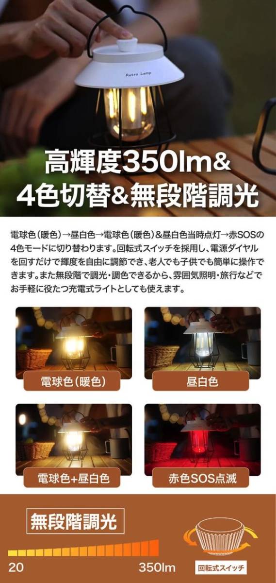 明るさは最高350lmまで、電球色(暖色)/昼白色/電球色(暖色)・昼白色点灯/赤SOSの4色モードに切り替わります。回転式スイッチを採用し、電源ダイヤルを回すだけで輝度を自由に調節でき、どなたでも簡単に操作できます。