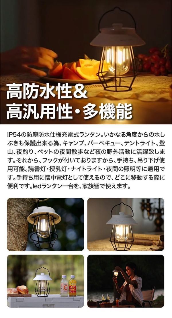 IP54の防塵防水仕様の充電式ランタンです。いかなる角度からの水しぶきも保護出来る為、キャンプ、バーベキュー、テントライト、登山、夜釣り、ペットの夜間散歩など夜の野外活動に活躍します。
