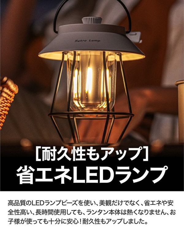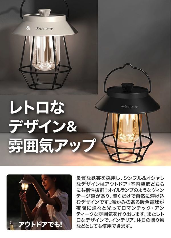アウトドアにも室内装飾にも相性抜群で、オイルランプのようなヴィンテージ感があり、置くだけで自然に溶け込むデザインです。温かみのある暖色電球が夜間に煌々と光ってアンティークな雰囲気を作り出します。またレトロなデザインで、贈り物にも最適です。