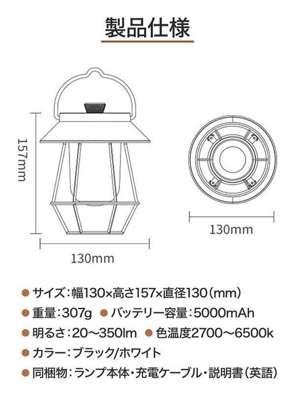 ランタンは高品質のLEDランプビーズを使い、美観だけでなく、省エネで安全性も高く、長時間使用してもランタン本体は熱くなりません。お子様が使っても十分に安心です。耐久性もアップしました。LEDランタンは130mm×130mm×157mmで、307gと小さく軽いので、アウトドア用としての持ち歩きや、非常時の持ち出し用にも便利です。