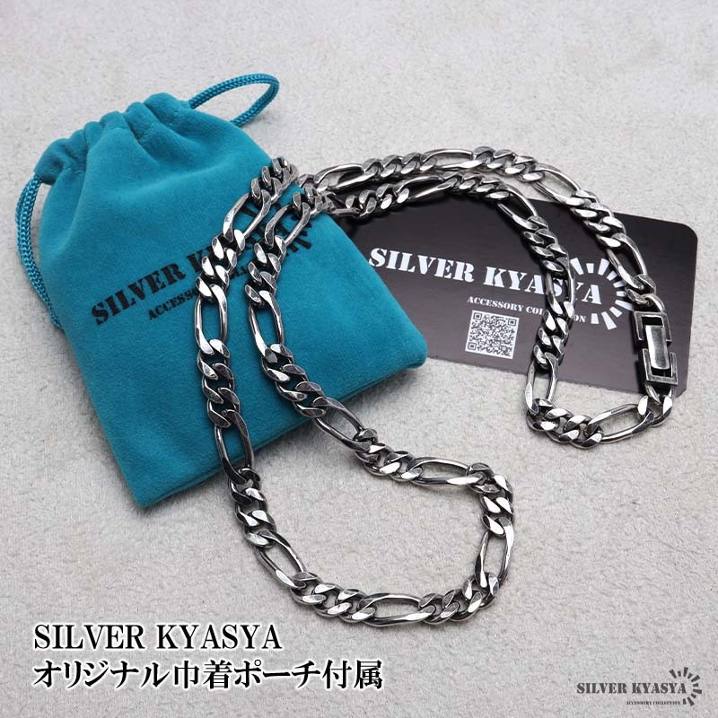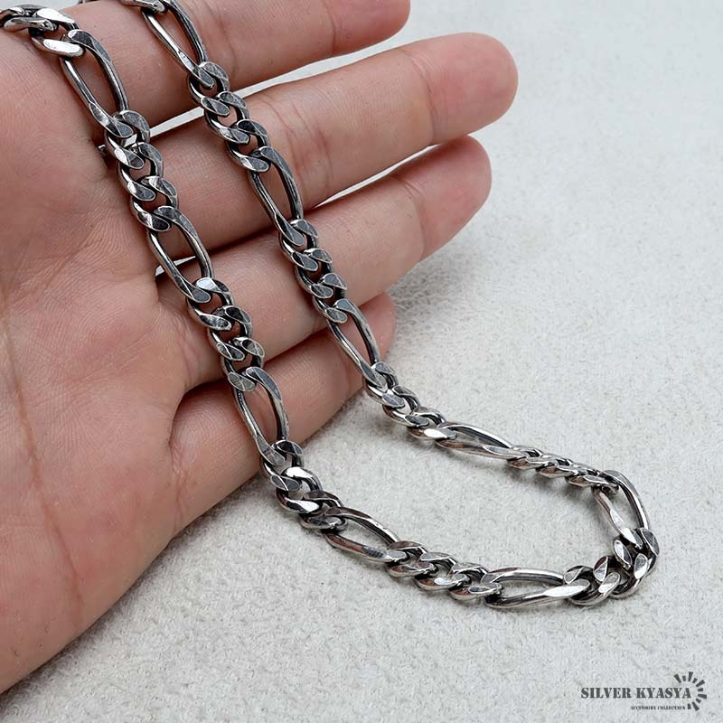 長いコマと短いコマを組み合わせて連ねたお洒落なデザインが魅力のフィガロチェーンネックレス。ユニークな6面カットと燻し加工により存在感をプラス。SILVER KYASYA独自のオリジナルデザインアイテムで、ここにしかないデザインを楽しめます。