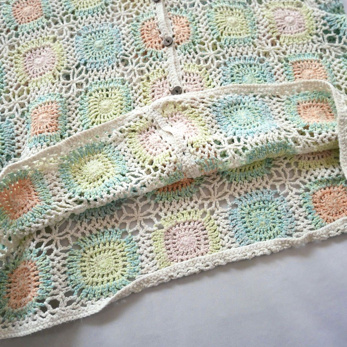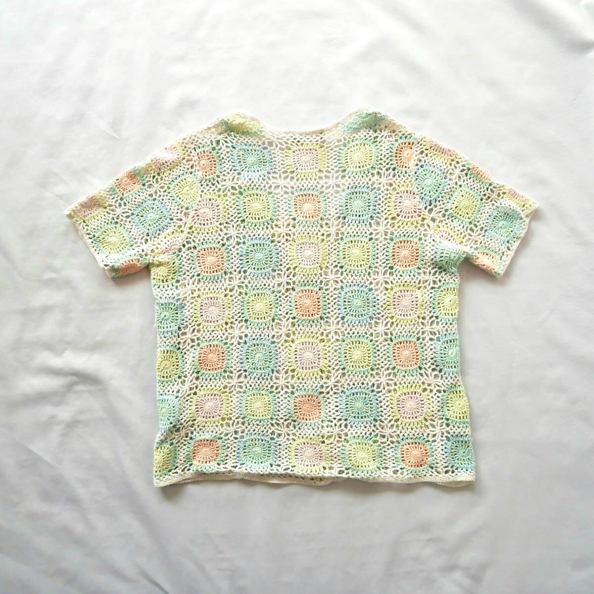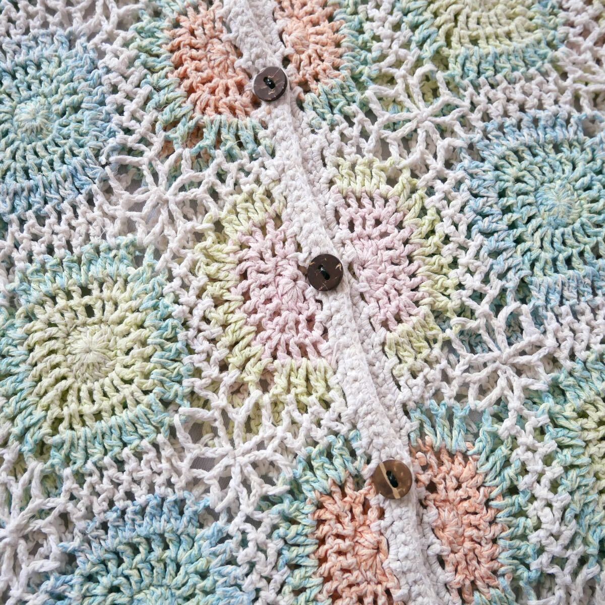 パステルカラーの鍵編みが可愛い、グラニースクエア半袖ニットカーディガンです。