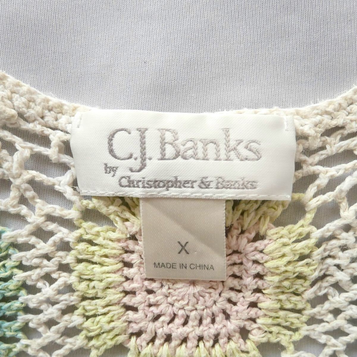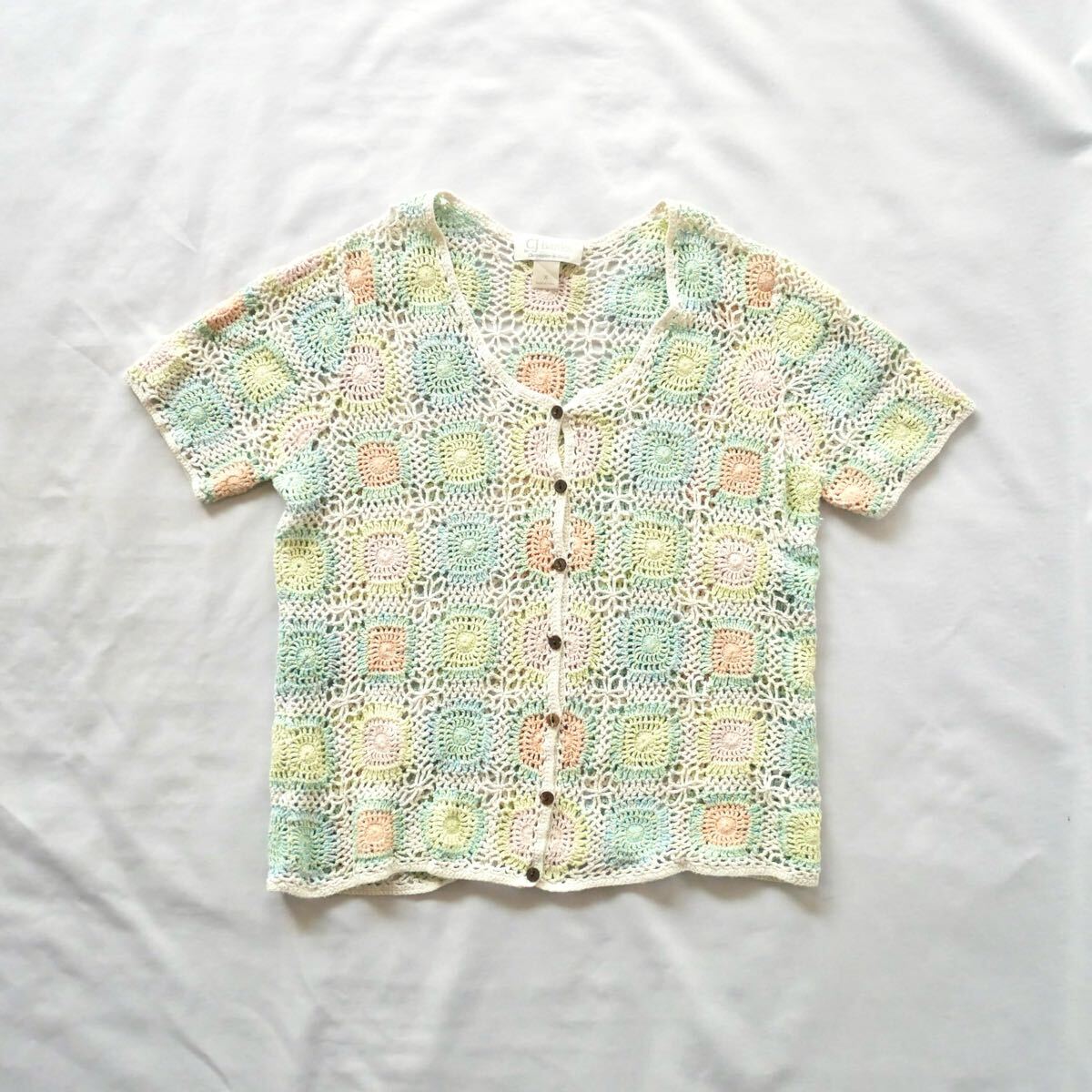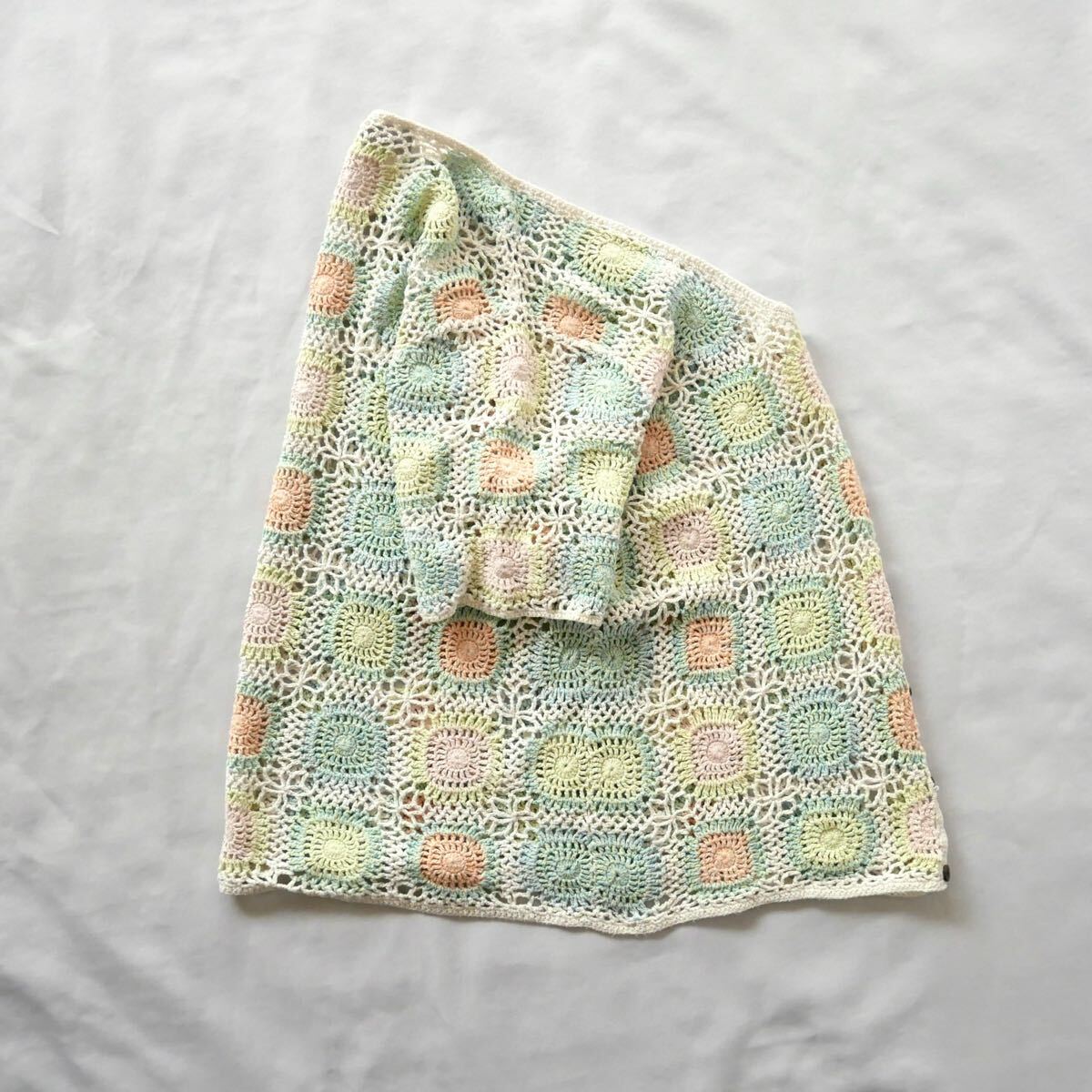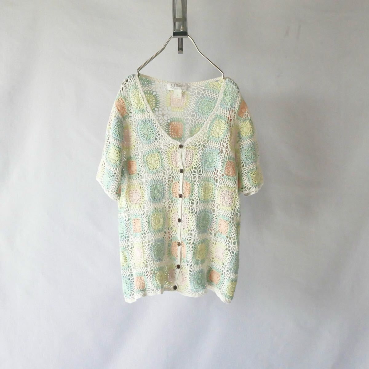 パステルカラーの鍵編みが可愛い、グラニースクエア半袖ニットカーディガンです。