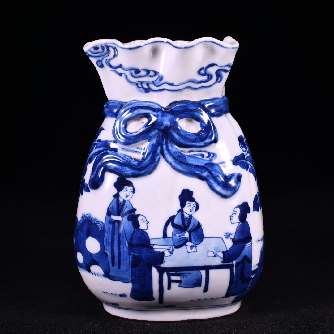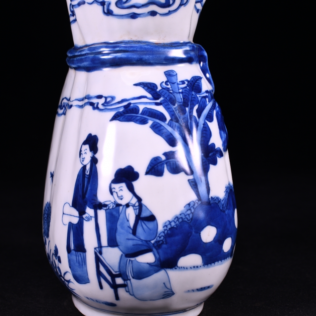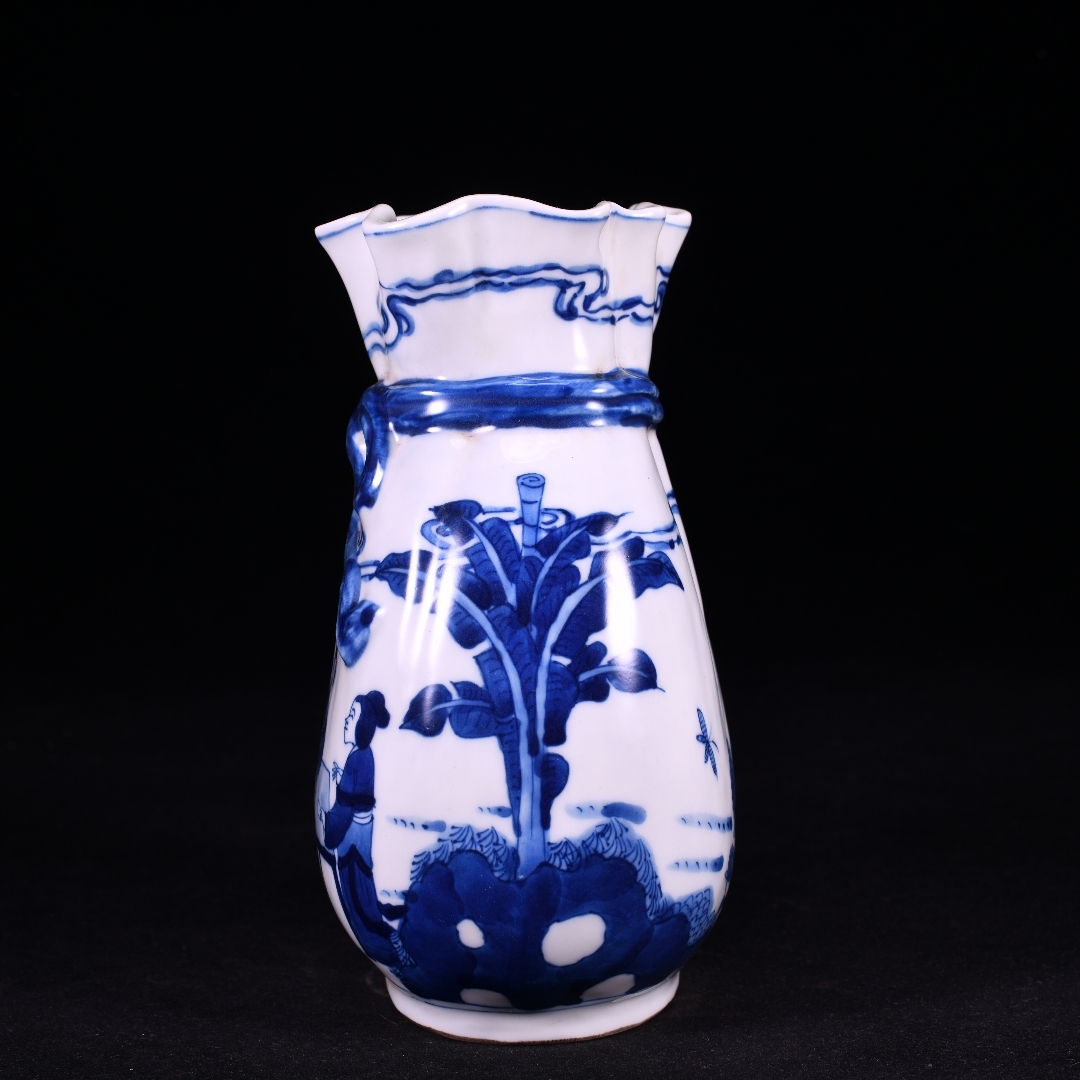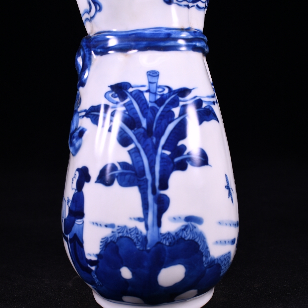 清時代 康熙年製款 古陶磁器 翠毛藍青花芭蕉美女故事紋 蝴蝶布袋瓶 花瓶 文案置物 極細工 古賞物 古美味 東洋彫刻 時代物 骨董 中国古美術
