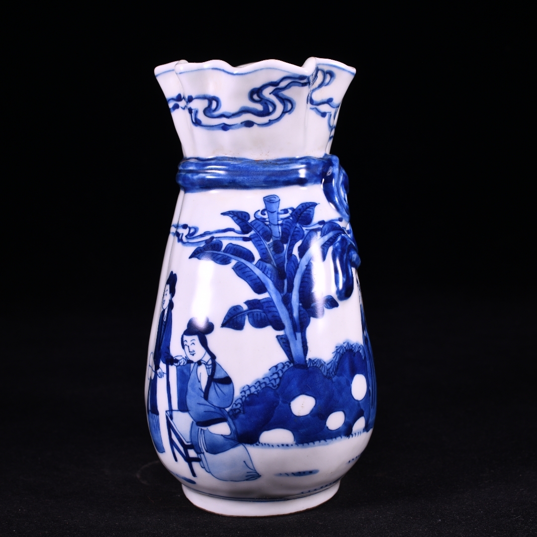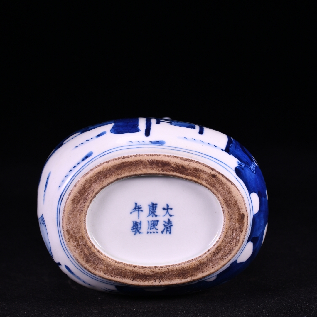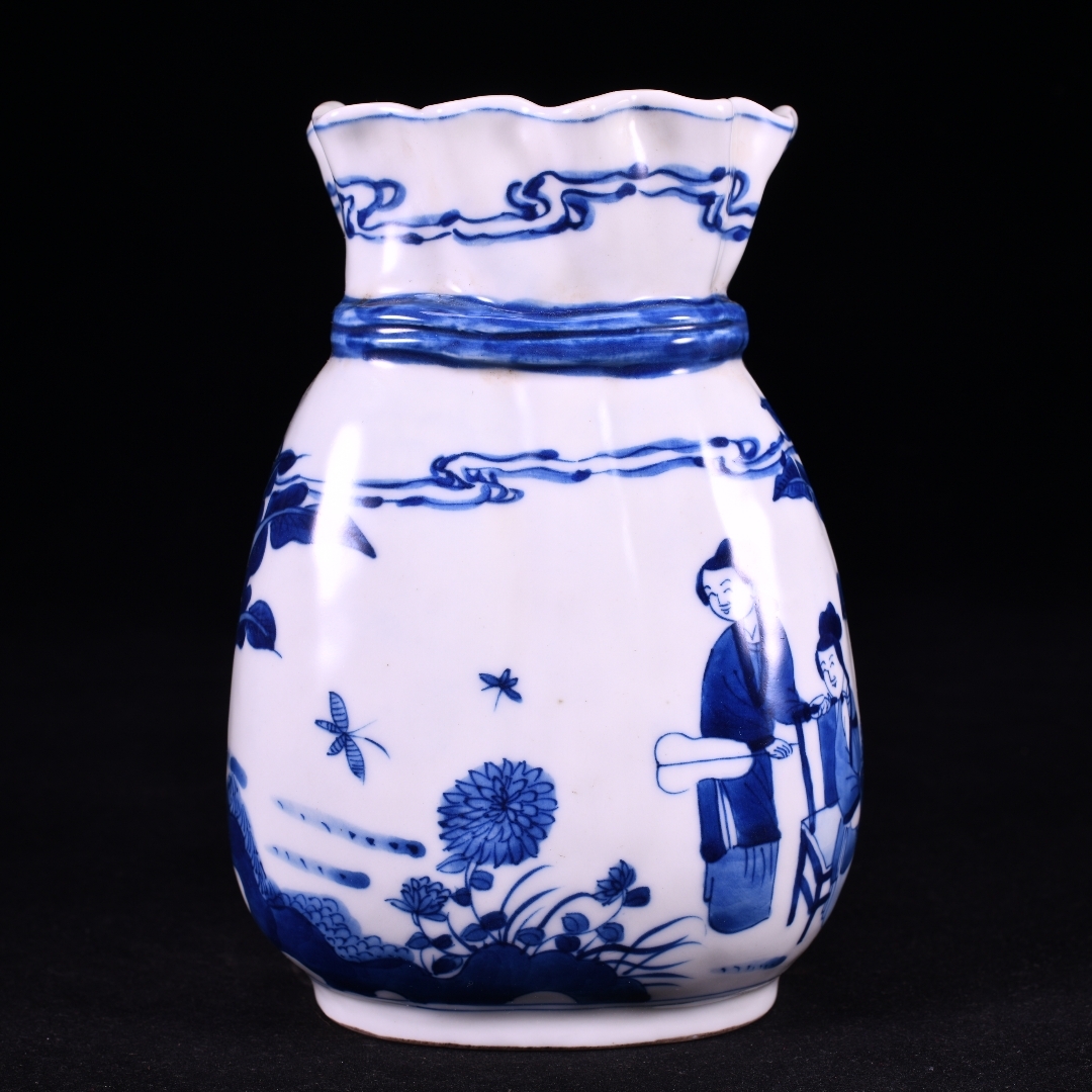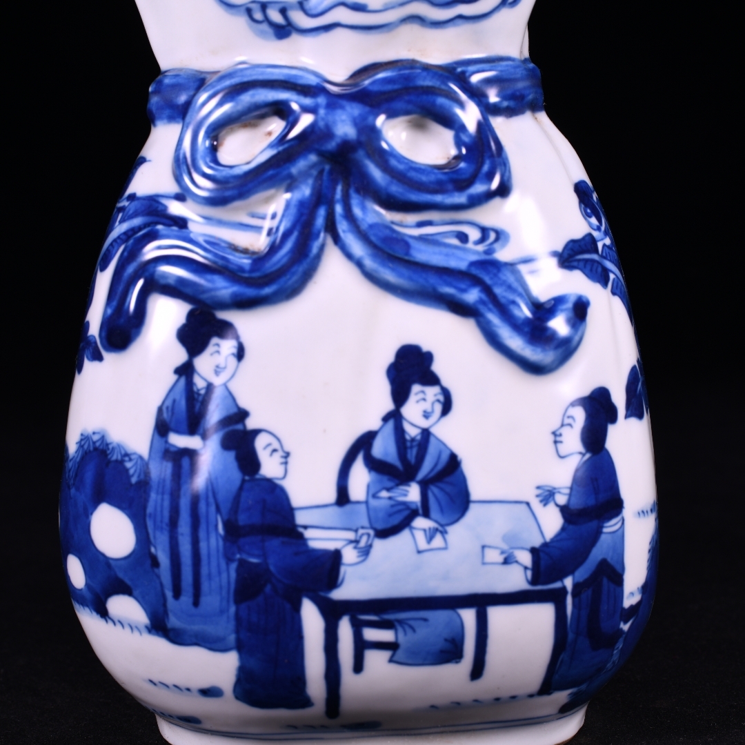 清時代 康熙年製款 古陶磁器 翠毛藍青花芭蕉美女故事紋 蝴蝶布袋瓶 花瓶 文案置物 極細工 古賞物 古美味 東洋彫刻 時代物 骨董 中国古美術