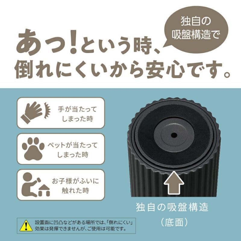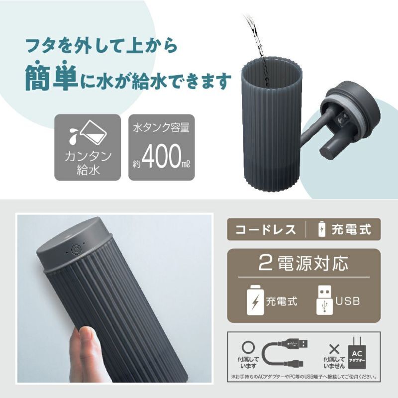 | 状態:未使用品です。 商品説明 どこでも加湿できる、倒れにくい加湿器 独自の吸盤構造で倒れにくい加湿器。小型サイズでデスクやベッドサイドに最適。 商品仕様 ■型番:KWZ-0531B ■電源:DC5V USB端子 ■消費電力:2.5 W(充電時) ■サイズ(約):W8.5 ×D8.5 ×H19.5 cm ■質量(約):360 g ■USBケーブル長さ(約):1.0 m ■内蔵充電池:リチウムイオン電池 ■充電時間(約):5 時間(電池が空状態から充電を開始/室温25℃) ■使用時間(約):USB運転:8 時間、充電池運転: 4 時間(満充電状態から使用/室温25℃) ■加湿性能(約):1時間あたり50 ml ■水タンク容量(約):400 ml ■付属品:取扱説明書・保証書×1、USBケーブル×1、給水芯×3(1本は本体取付済) |