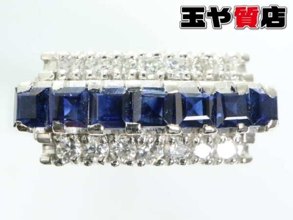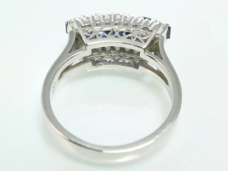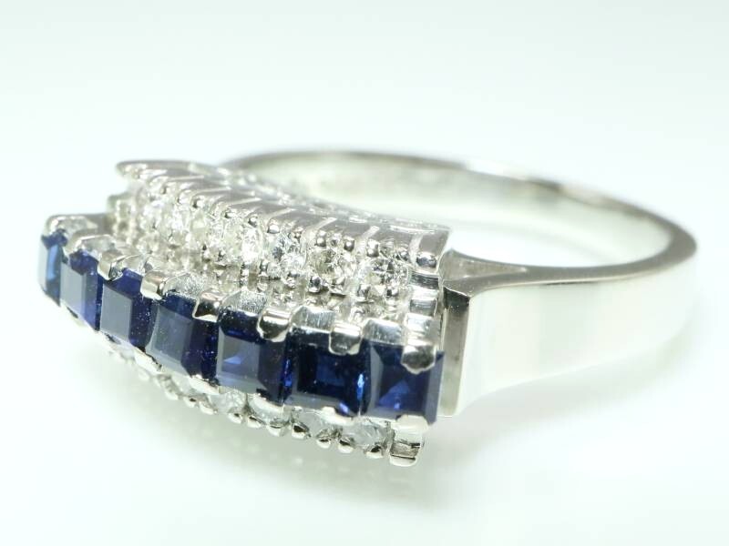 【商品説明】  センターにバケットカットのサファイヤの一列とその両方にブリリアントカットのダイヤが一列ずつ並んで上品にアピールしています。ダイヤは内包物も少なくて輝いています。