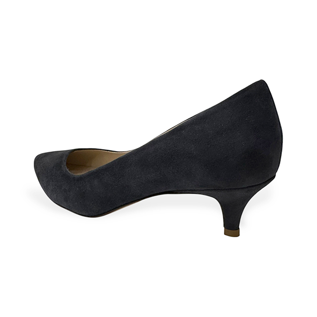 ポインテッドトゥでキトゥンヒールの日常的に使いやすいモデルで、アッパーはネイビーのスウェードになっています。