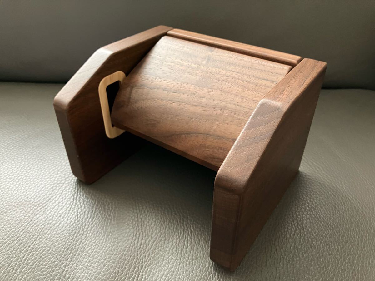 工房ペッカーのペーパーホルダーは、見た目の美しさはもちろん、使いやすさにもこだわった贅沢な逸品です。ロールを掛けるパーツまで無垢の木材を使用し、厳選されたウォールナットの上質なぬくもりが空間を華やかに、そして柔らかく演出します。