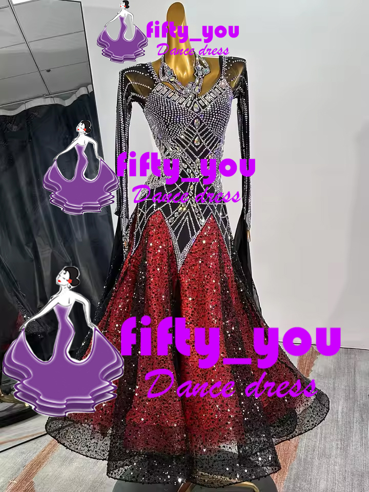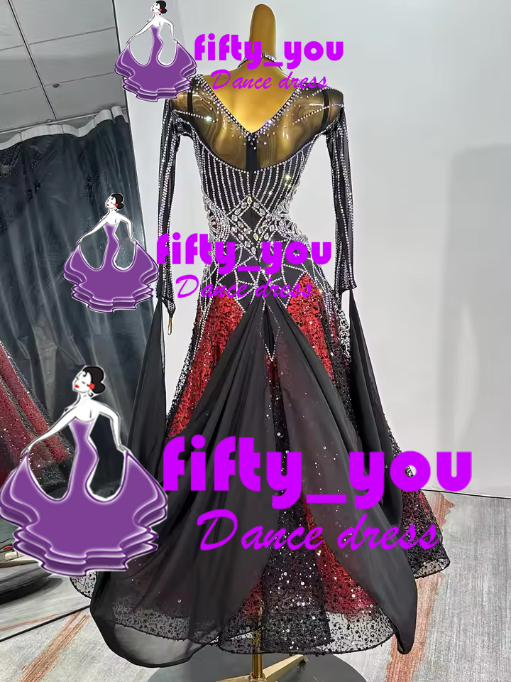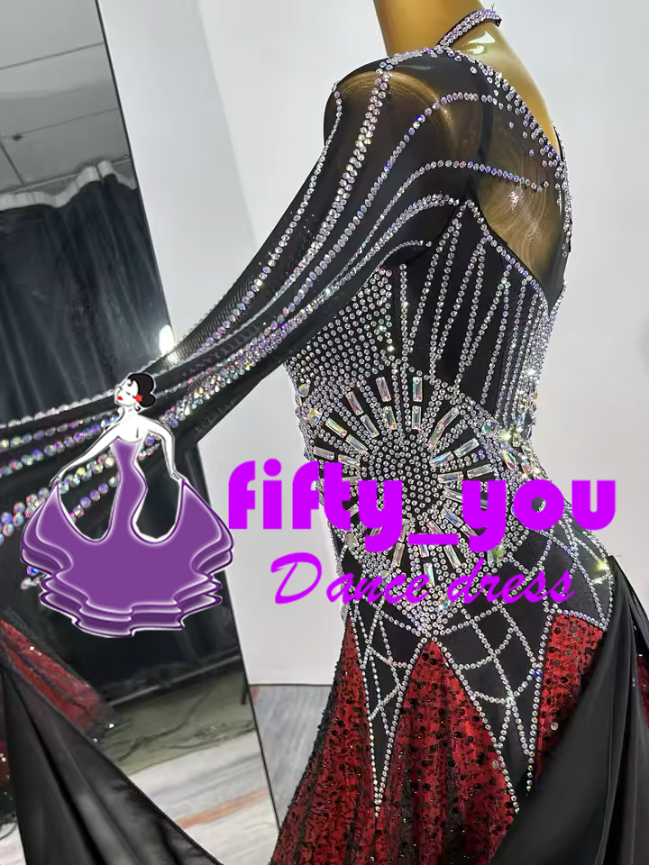 新品fifty_you レディース社交ダンスドレス  モダン競技ドレス  サイズオーダー  スタンダードドレス  輝きストーン飾り 黒赤