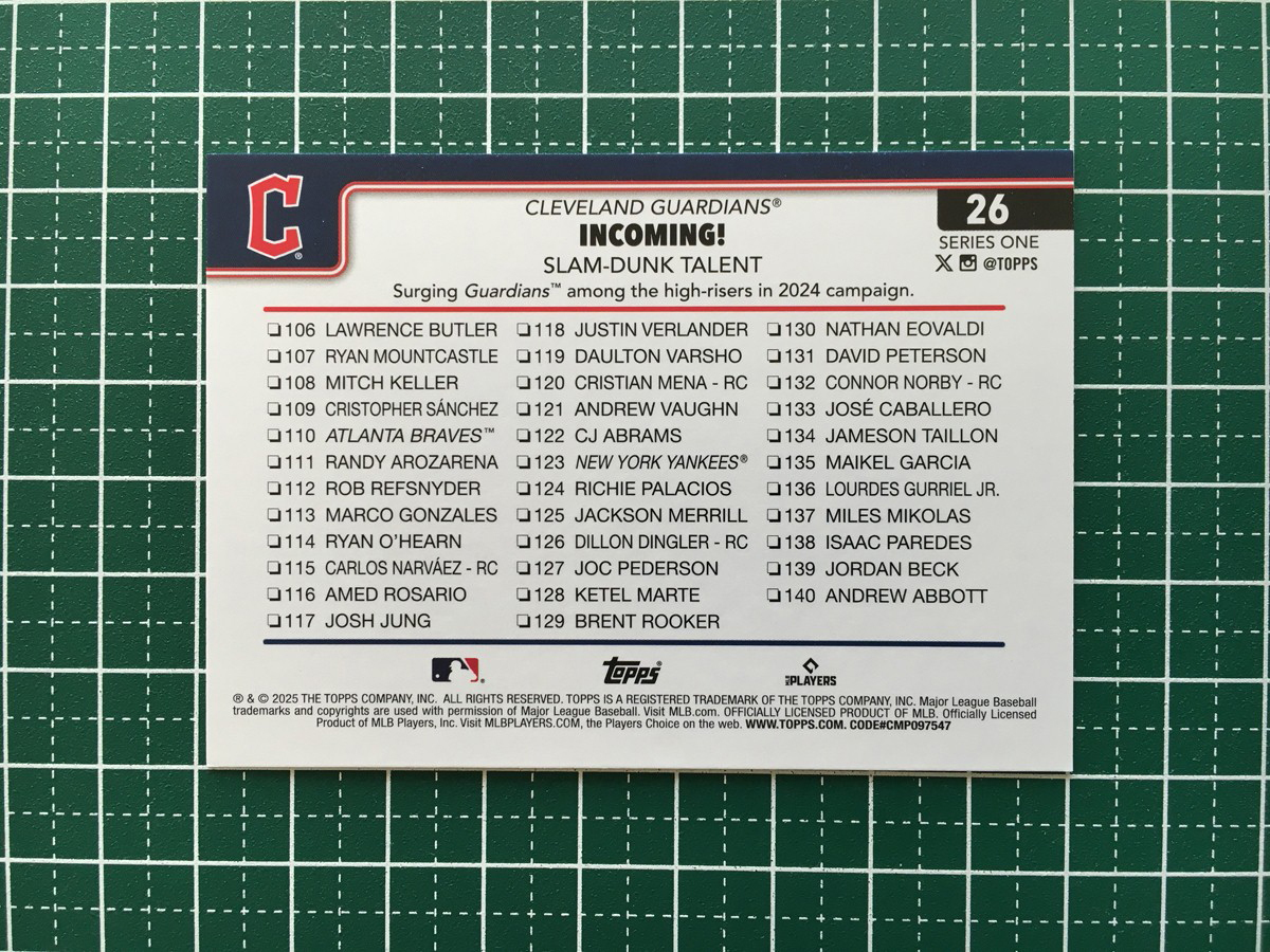 ★TOPPS MLB 2025 SERIES 1 #26 INCOMING!/WILL BRENNAN/STEVEN KWAN[CLEVELAND GUARDIANS]ベースカード「CHECKLIST」★