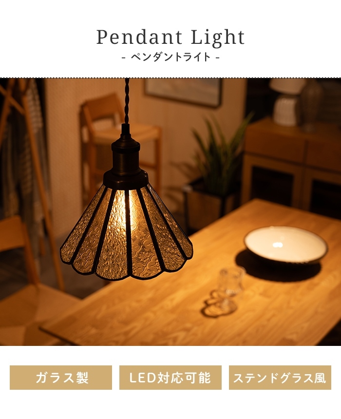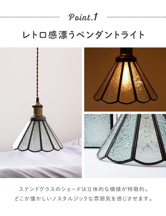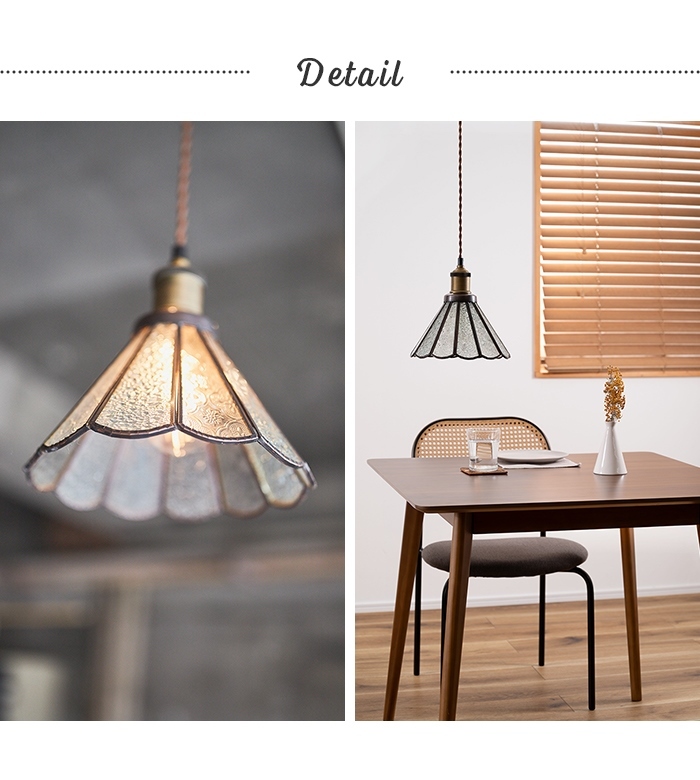 レトロ感漂うペンダントライト。 ステンドグラスのシェードは立体的な模様が特徴的。 どこか懐かしいノスタルジックな雰囲気を感じさせます。 一灯はもちろん。広範囲には多灯付けがおすすめです。 形も特徴的なステンドグラス。シンプルだけど可愛らしいステンドグラスは消灯時にも立体的なデザインがインテリアとして演出してくれます。 点灯時の表情の変化。シェードの内側は光を反射して美しいデザインを楽しめます。消灯時とはまた違った表情をお楽しみください。 ご家庭のシーリングプラグに付けられます。 コードの長さを調整できます。 |