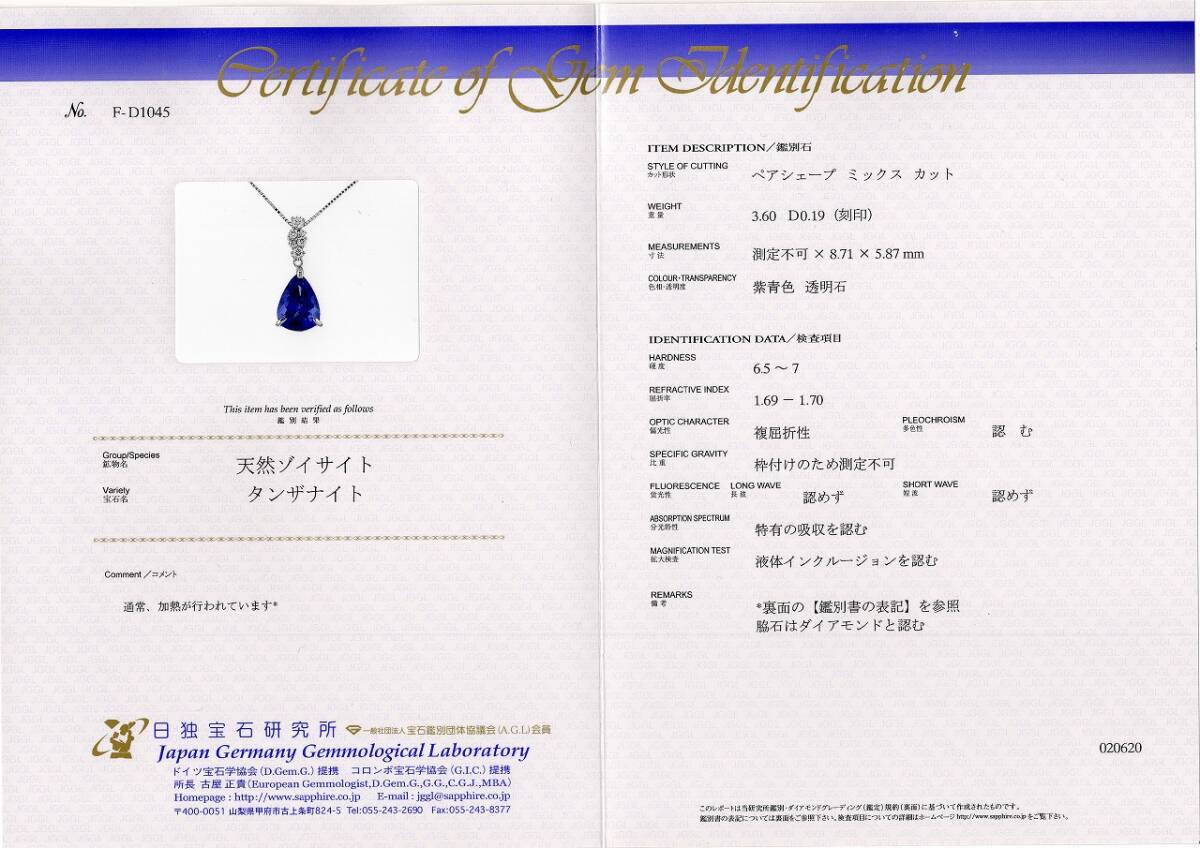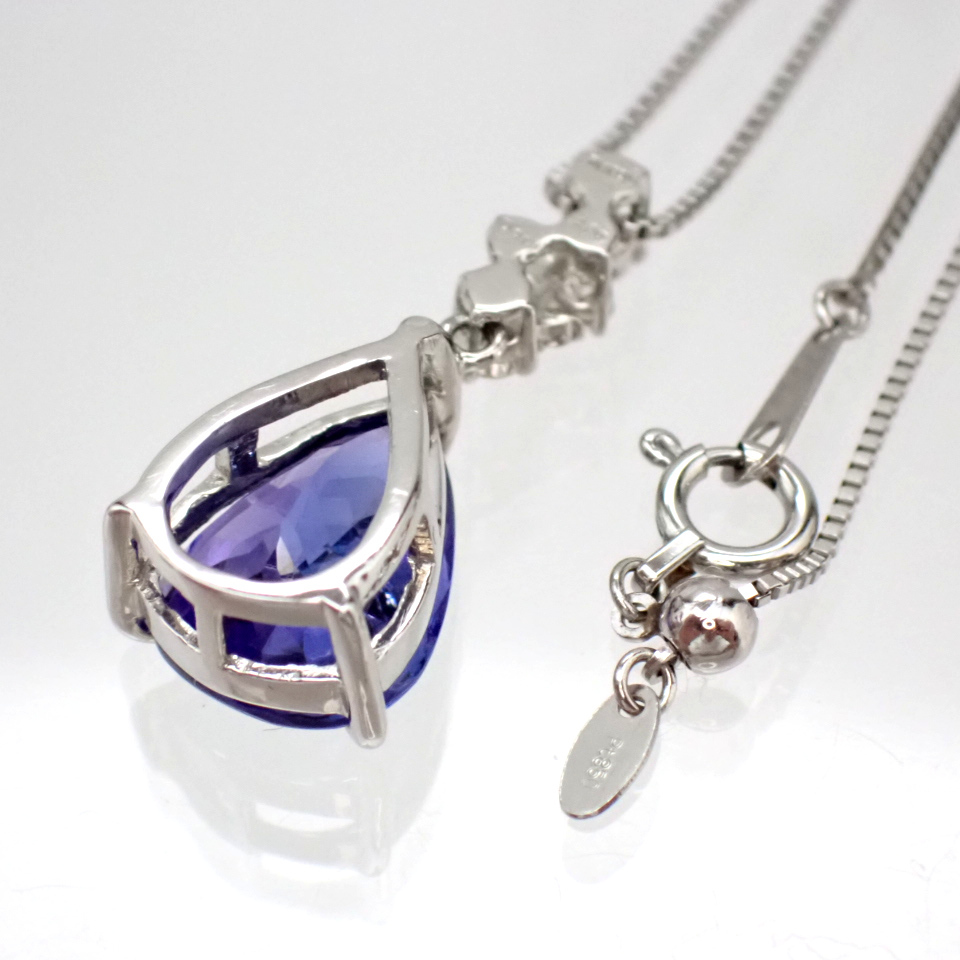 | ご覧いただきまして誠にありがとうございます。 当方は真面目に商品とお客様と向き合って行きたいと考えております。 どうぞ宜しくお願い致します。 ・中石: タンザナイト 3.60ct ・脇石: ダイヤモンド 計0.19ct ・素材: PT900/850(刻印あり) ・重量: 約4.80グラム ・最大縦幅: 約23.3ミリ(カン部分含む) ・最大横幅: 約9.3ミリ ・最大厚み: 約6.8ミリ ・全長: 45センチフリーアジャスター付 ・状態: 新品 ・付属品: 日独鑑別書・当店保証書 タンザナイトジュエリーのご紹介です。 宝石の中でも今やトップクラスの人気のタンザナイト。 その人気の理由はやはり単純にわかりやすい素直な綺麗さと、ブルーとパープルの美しい多色性によるものでしょう。 こちらも豊かな多色性と濃厚な美色がたまらない逸品で、上質な一石であることと共にタンザナイトの人気の高さを再確認いたしました。 そしてタンザナイトは硬度があまり高くない宝石であることはよく知られていると思いますが、カットと研摩が難しい宝石であることは意外と知られていません。 ですのでパッと見は綺麗でも、ルーペで見るとスレや磨き残しがあることが少なくありません。 しかしこちらは完璧なカッティングと全ファセットポリッシュで、欠点の無い仕上がりとなっております。 インクルージョンもほぼルーペクリーンの素晴らしい透明度。 デザインは大小の極上メレダイヤを散りばめたカンにぶら下がりタイプのシンプルデザイン。 このようなシンプルなデザインは、メイン石の品質が全てです。 ダイヤの取り巻きタイプですと多少のアラなどはごまかせたりしますが、こちらのようなシンプルデザインはメイン石によほど自信がないとできるものではございません。 ですので品質に関してはご安心いただければ幸いに存じます。 極めて高品質な大粒タンザナイトジュエリーです。 是非この機会にいかがでしょうか。 ※「興味はあるけど少し不安で購入に踏み切れない」という方は「返品について」に記載してございます、「安心の無料返品システム」をご参照の上ご活用いただければ幸いです。 ご質問などお気軽にお問い合わせください。 誠実に対応させていただきます。 | |