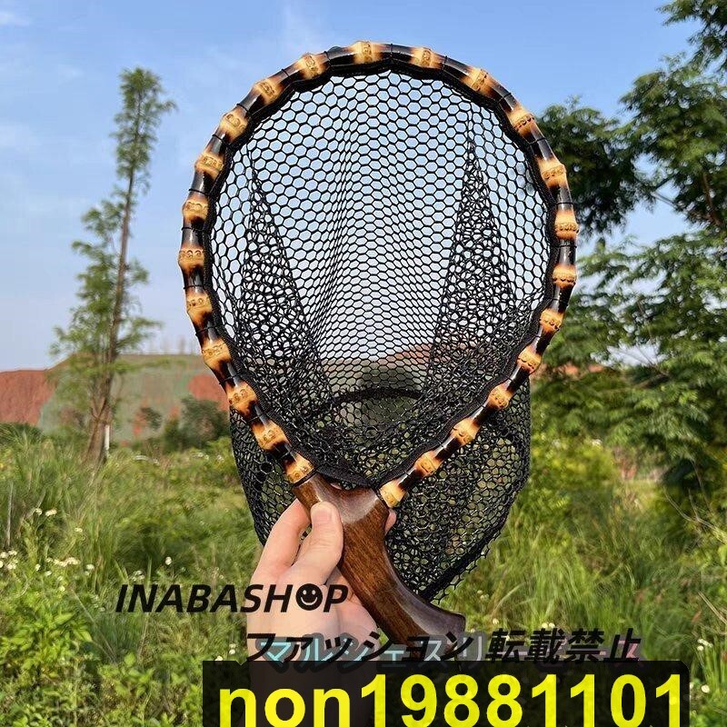 軽量 玉網 天然竹 天然木製 ランディングネット タモ網 クランク ハンドル ウッドラバーネット フライフィッシング