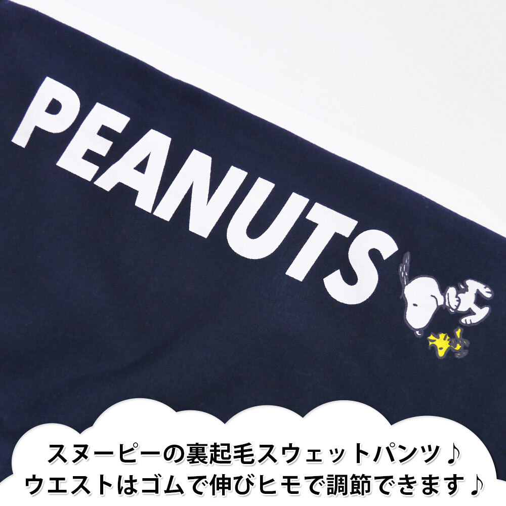 正規店仕入れの新品未使用品です 綿とポリエステル素材で、吸汗速乾に優れます スヌーピーの裏起毛スウェットパンツ ウエストはゴムで伸びヒモで調節できます |