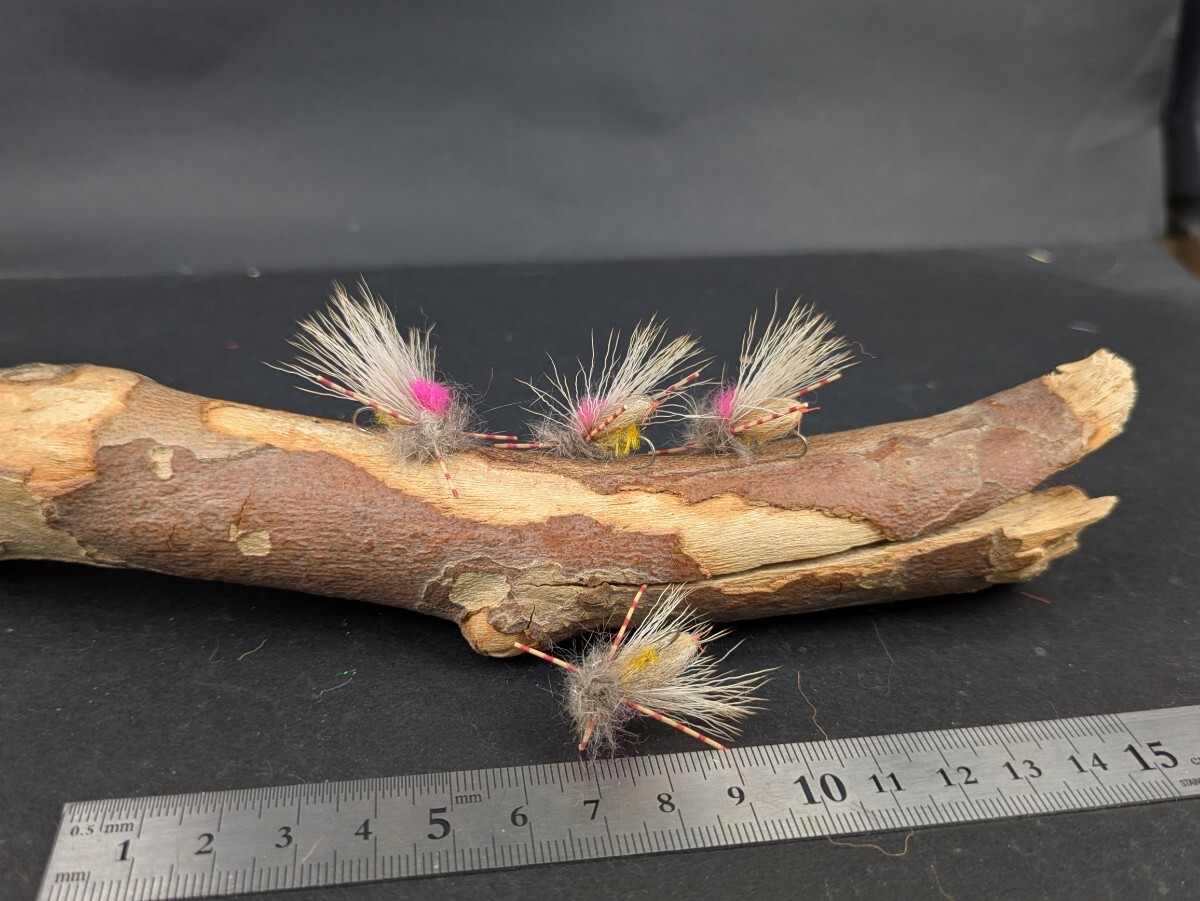 色々と拘りはあります。ボディ下巻きに秘密素材を巻いてます。マシュマロ部は色に拘り秘密素材を数種類混ぜ合わせています。レグにはこのフライの大きさに合う太さのラバーを使ってます。