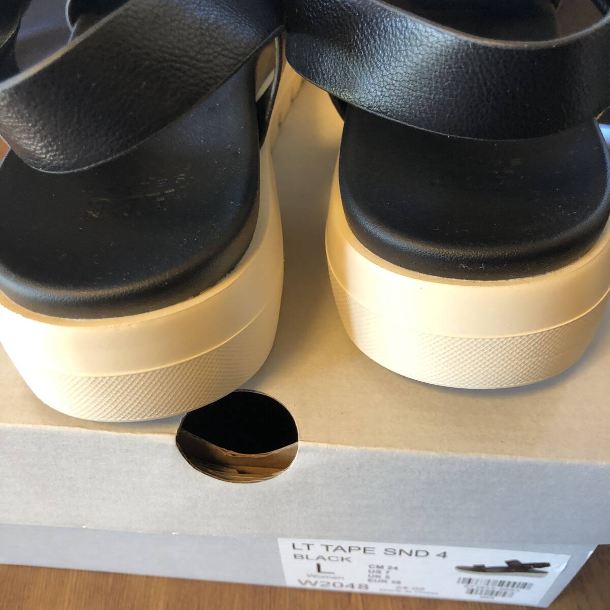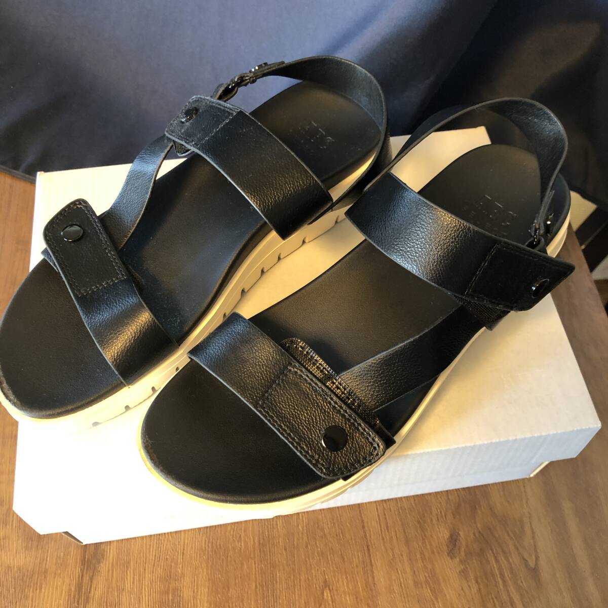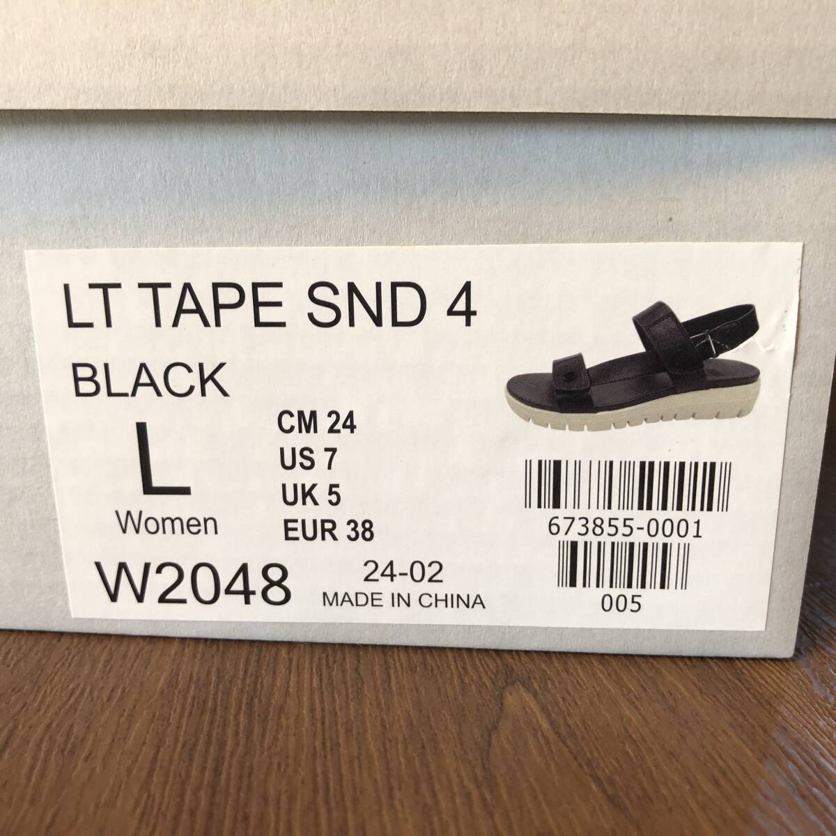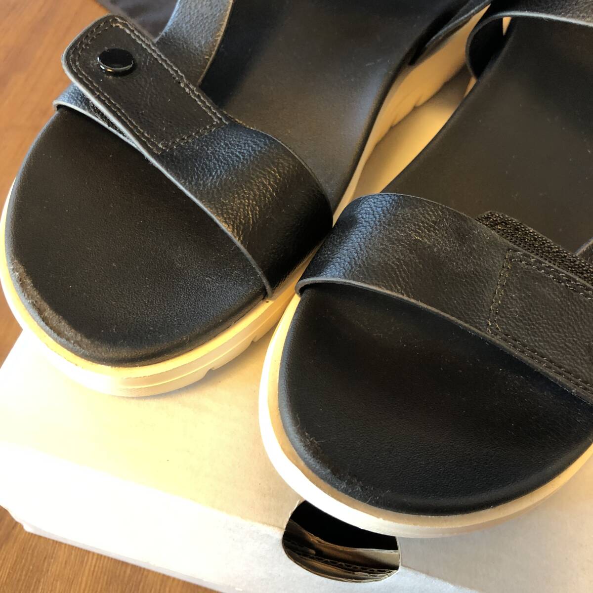 レザーの様な風合いの素材でカジュアルテイストに仕上げたテープサンダルデザインです。