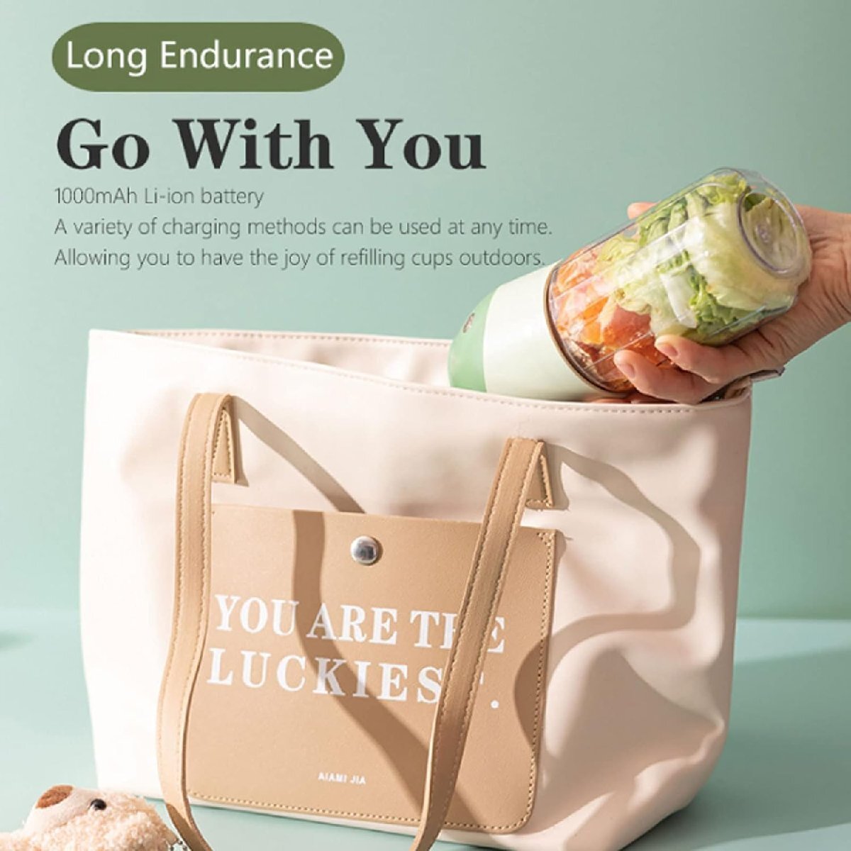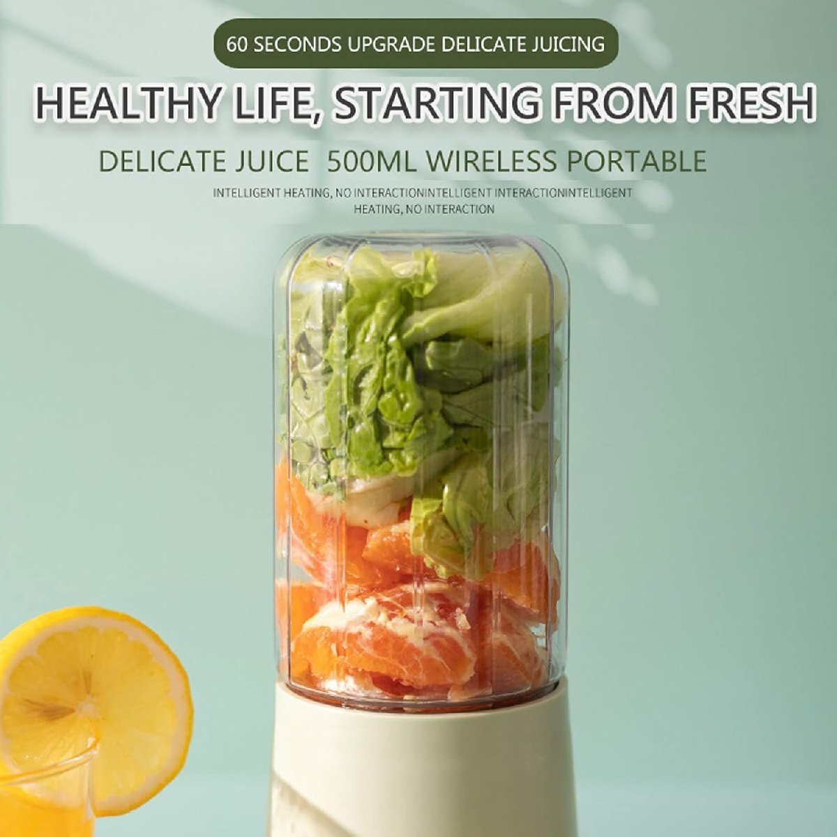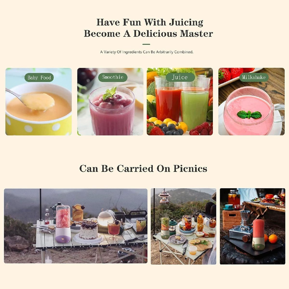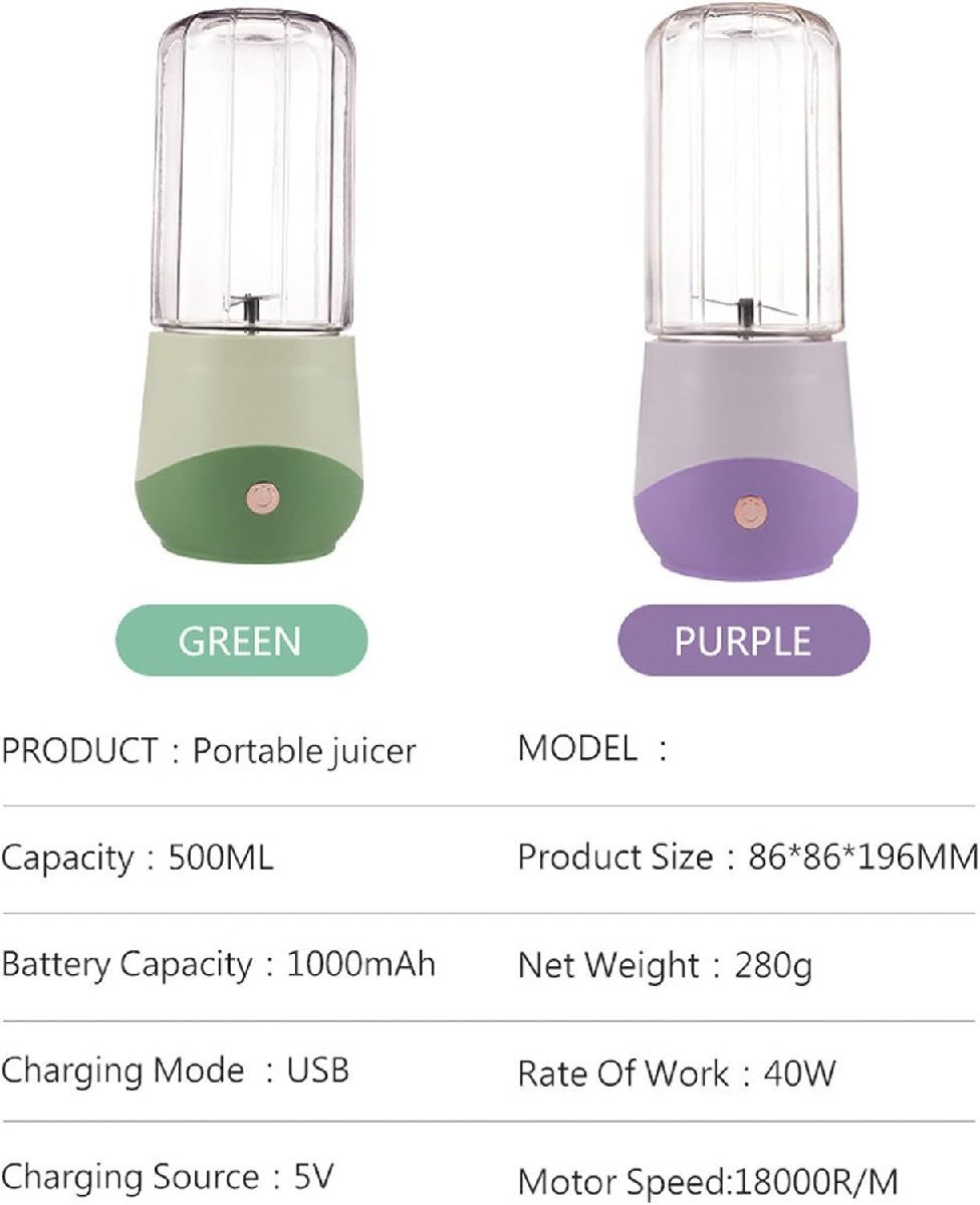 500ML USB安全充電:USBジューサーブレンダーには、パワーバンク、ACアダプター、コンピューターによる充電など、どこでも充電できる1000mAhの高品質充電式バッテリーが装備されており、充電時間は2~3時間です。完全に充電すると、1回の充電で20~25杯のジュースまたはスムージーを生成できます。