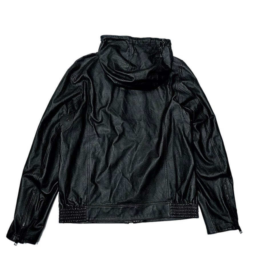 ・送料無料 超美品 ディーゼル DIESEL レザージャケット パーカー ブルゾン アウター シープスキン 羊革 本革 ジップアップ フード フーディ XL 黒 ブラック系 メンズ