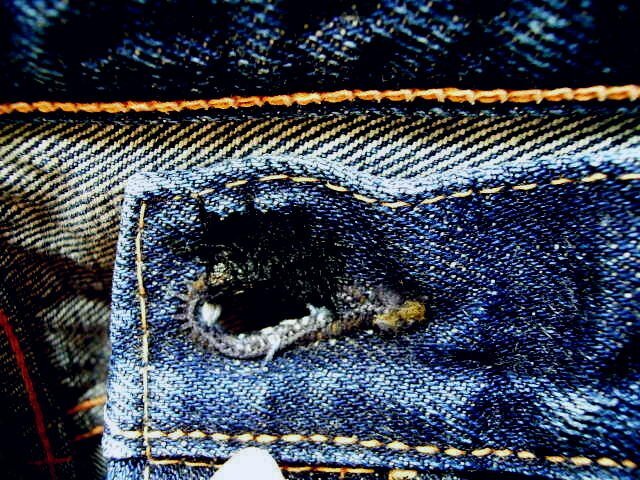 ●ギャラ入り革パッチ ●バナナイエローアーキュエイトステッチ ●アウトシーム赤耳 ●片面BIG E ●隠しリベット  ●コインポケット赤耳 ●フロントVステッチ  etc...