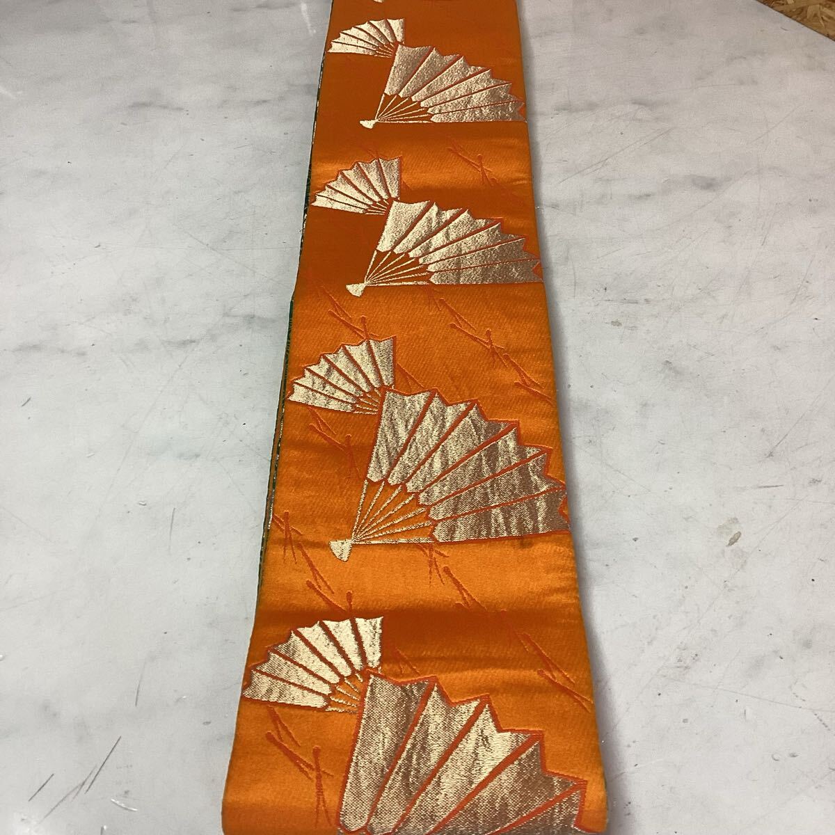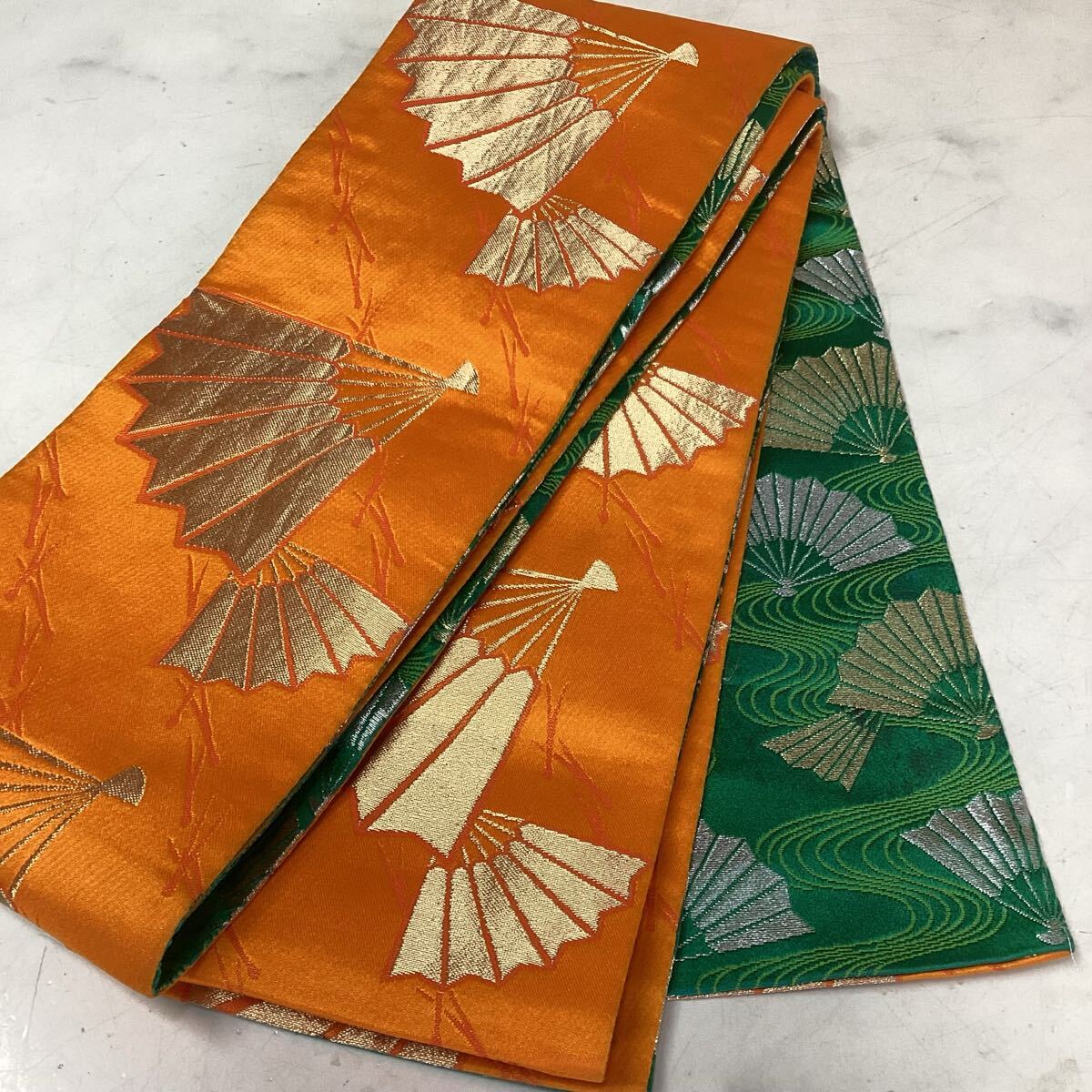 緑とオレンジの扇子模様の帯、華やかなデザインが特徴。