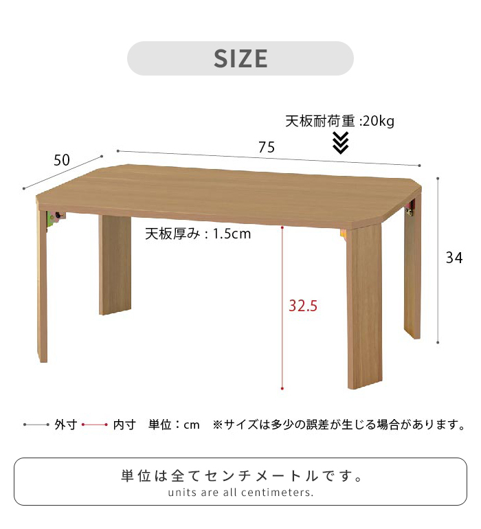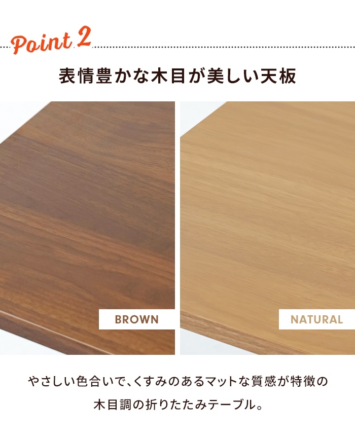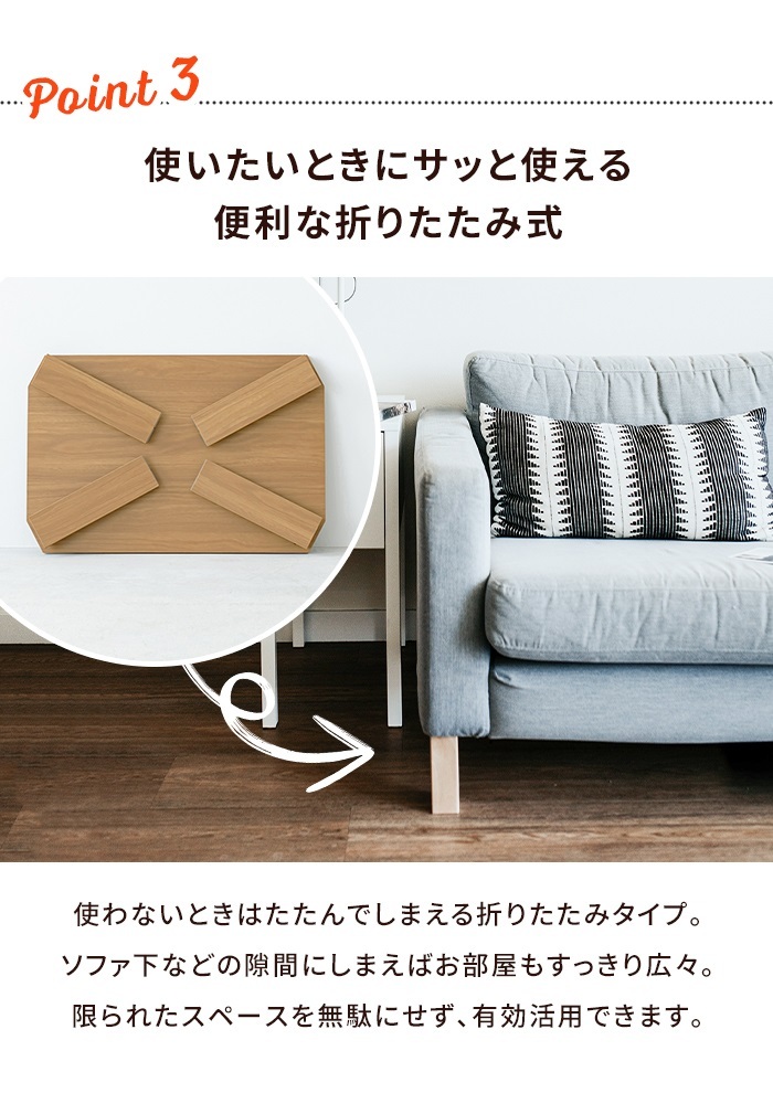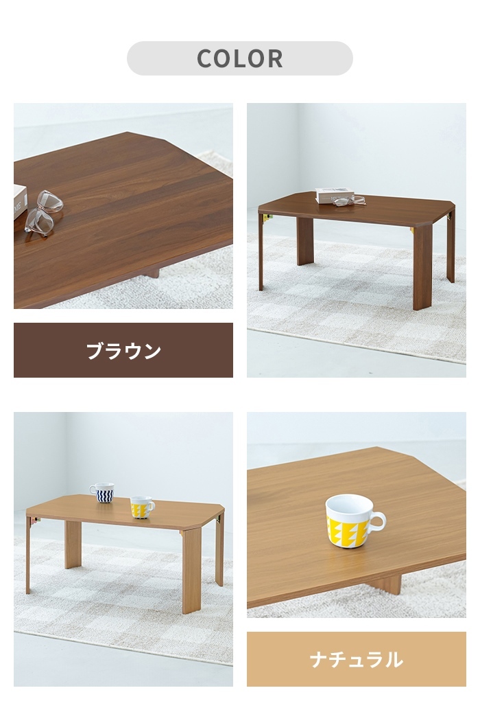 ・折りたたみできます ・なめらかでお手入れしやすい天板 ・天板裏表木目柄仕様 ・脚裏フェルト付 ・折りたたみ式 ・すぐに使える完成品 |