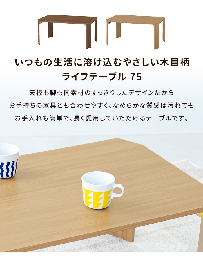 いつもの生活に溶け込むやさしい木目柄 ライフテーブル75 やさしい色合いで、くすみのあるマットな質感が特徴の木目調の折りたたみテーブル。 ひとりでも複数人でもシーンに合わせて使える天板75サイズ、天板高は床に座って使うのも、ソファー前でも使いやすい約34cm。 天板も脚も同素材のすっきりしたデザインだからお手持ちの家具とも合わせやすく、 なめらかな質感は汚れてもお手入れも簡単で、長く愛用していただけるテーブルです。 使わない時は折りたたんで収納でき必要な時はさっと広げて使えます。 |