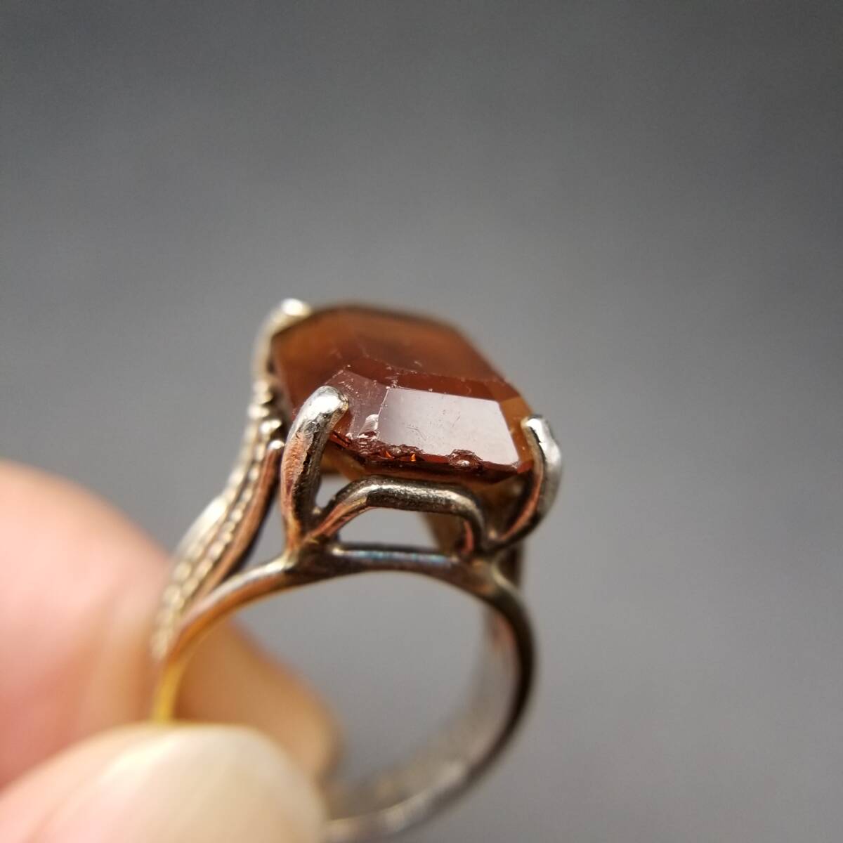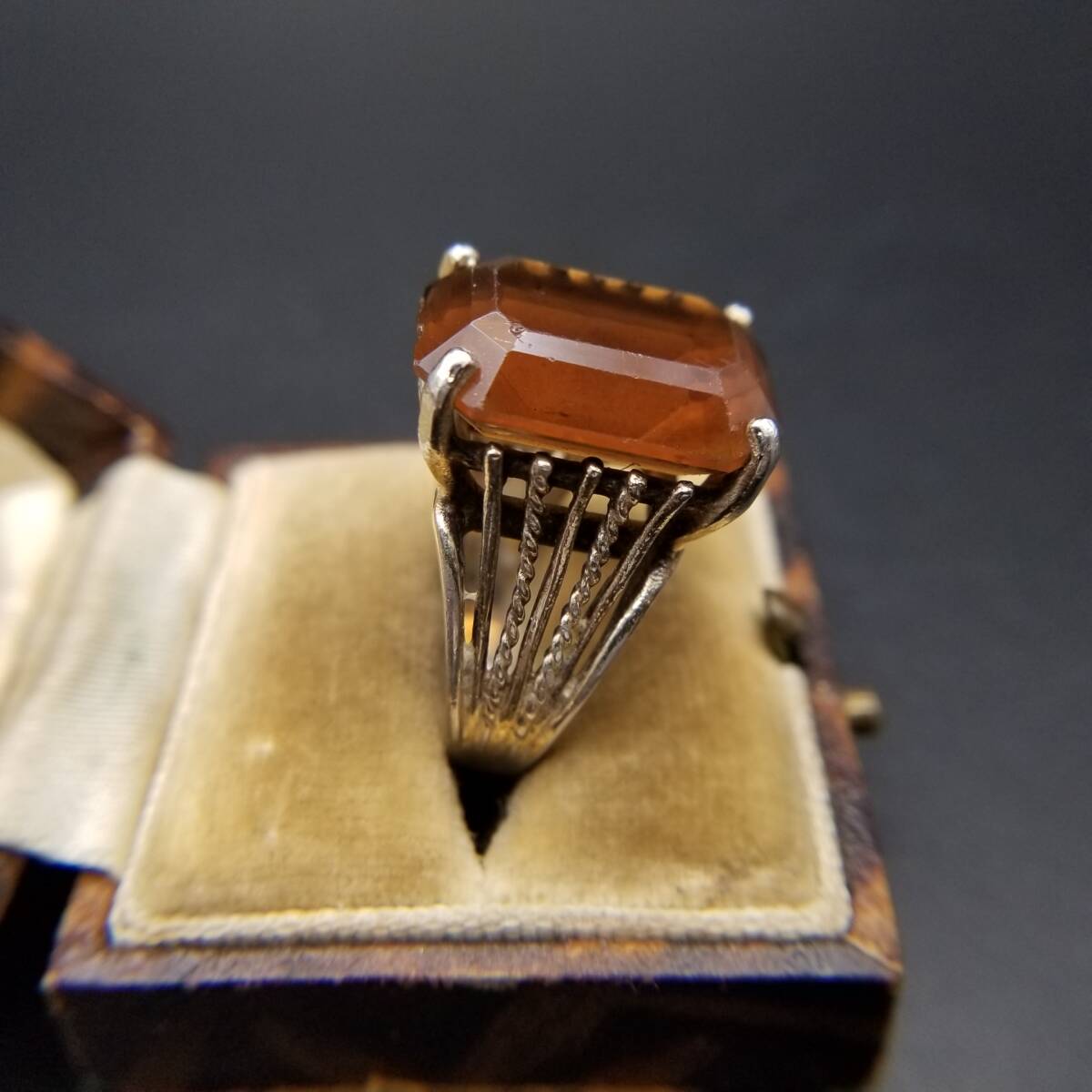 大粒 ブラウンガラス エメラルドカット 925 シルバー ヴィンテージ リング 銀 指輪 アールデコ 5連 ステートメントジュエリー R15-E