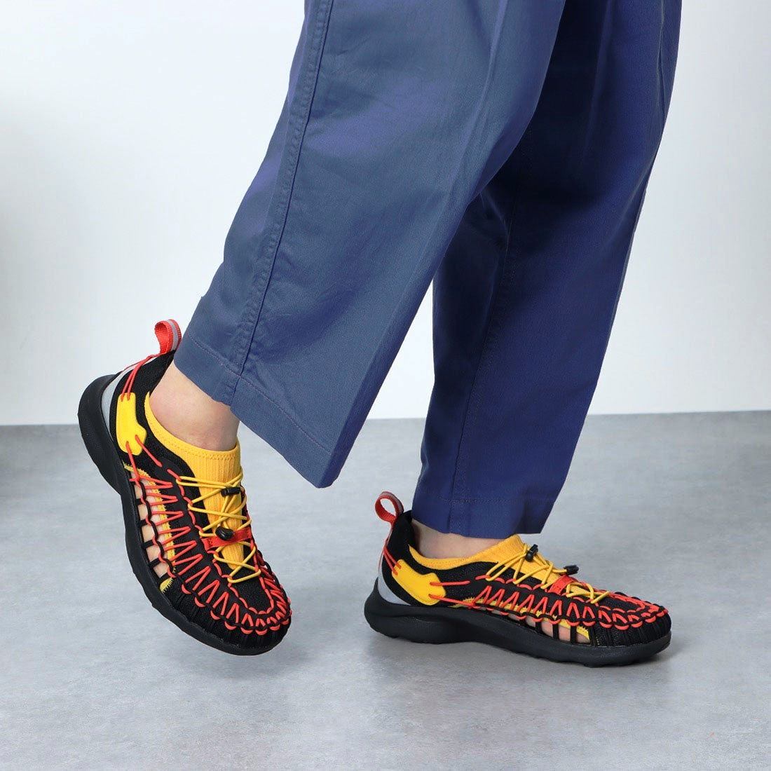 まったく新しい発想から生まれた、どんなシューズとも異なる革命的なモデル「UNEEK」にモダンなデザインを掛け合わせた次世代のスニーカー『UNEEK SNK』。UNEEKのアッパーデザインに、肉厚なミッドソールをハイブリッド。パテント取得済みのインターロッキングコードシステム、2本のポリエステル製伸縮コードが足の動きに合わせて変形し、優れたフィット感を提供します。高い通気性と速乾性に優れるメッシュライニングがドライで快適な履き心地を実現。暗がりでも目立ちやすいリフレクターをヒールプルに採用。タウンユースからアウトドアまで幅広いシーンで活躍します。