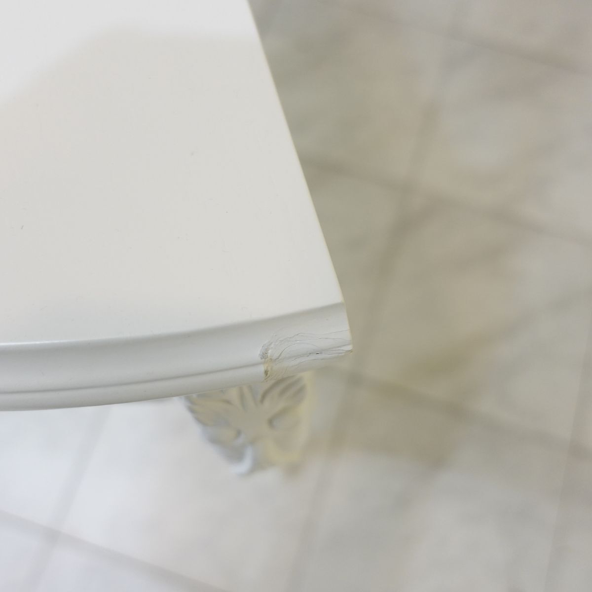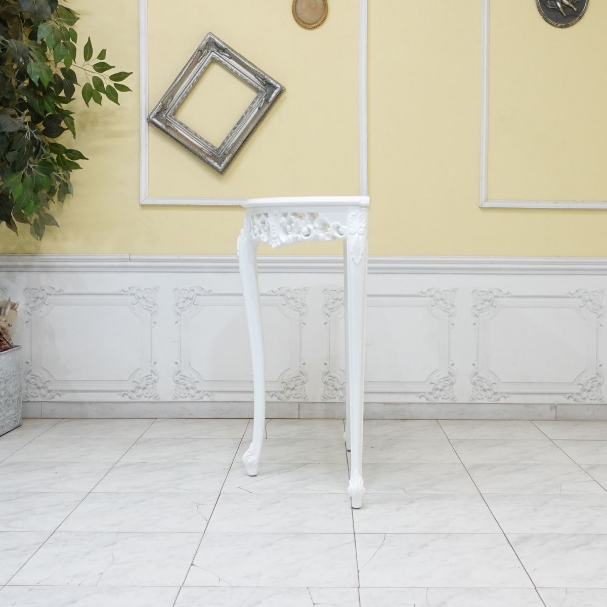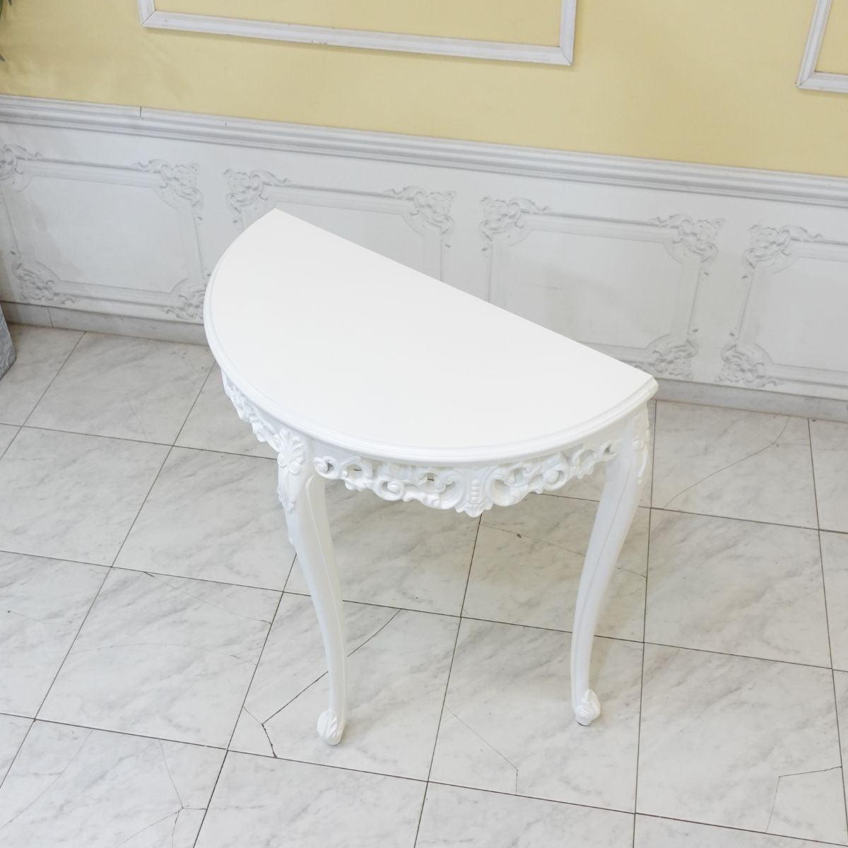 アウトレット コンソールテーブル サイドテーブル 半円 ハーフムーン アンティーク ホワイト 白 z4120-18サイズW 70cm x D 35cm x H 75cmコメント店舗什器としても活躍してくれる小ぶりな半円コンソールテーブル。アウトレット理由・輸入時に生じた右天板凹み