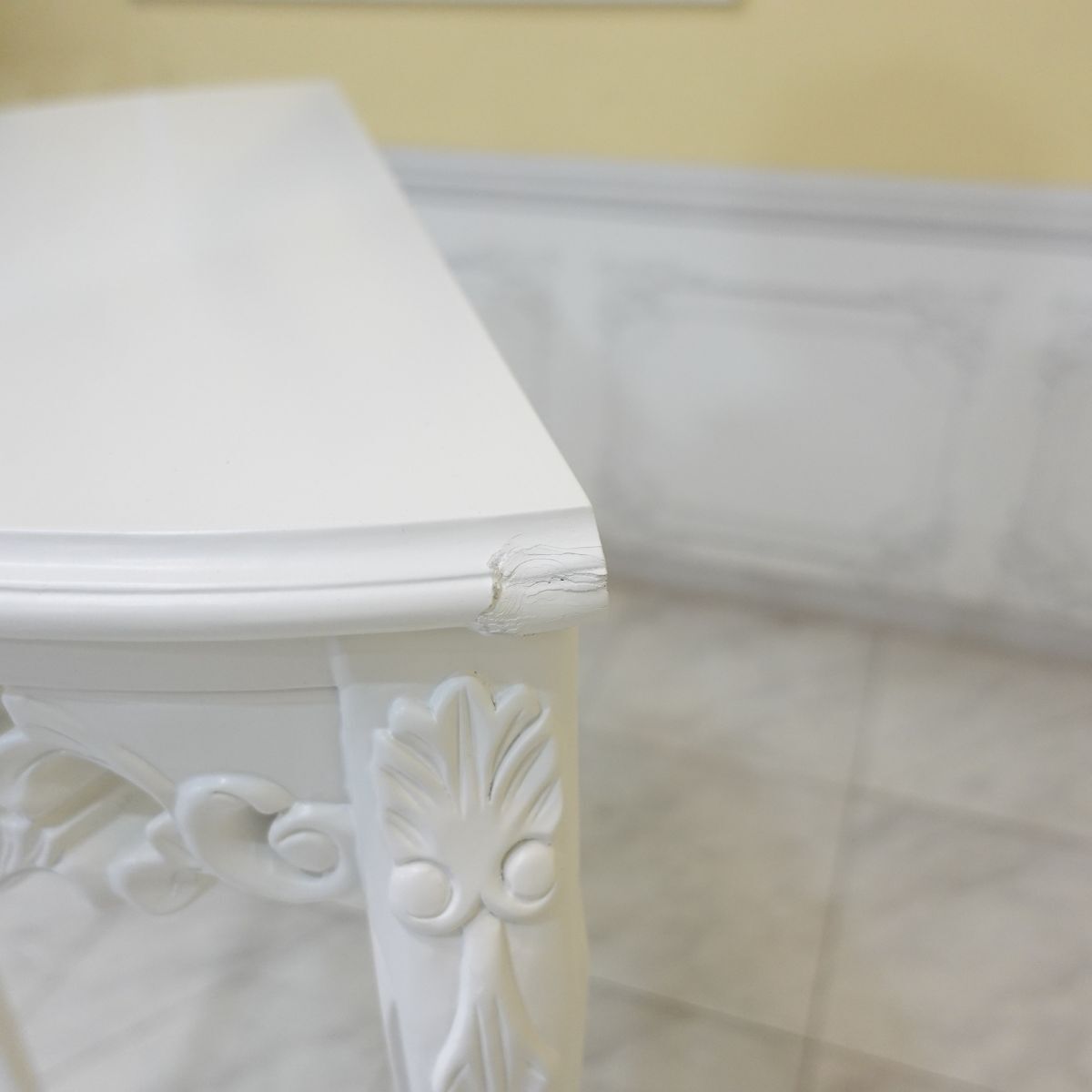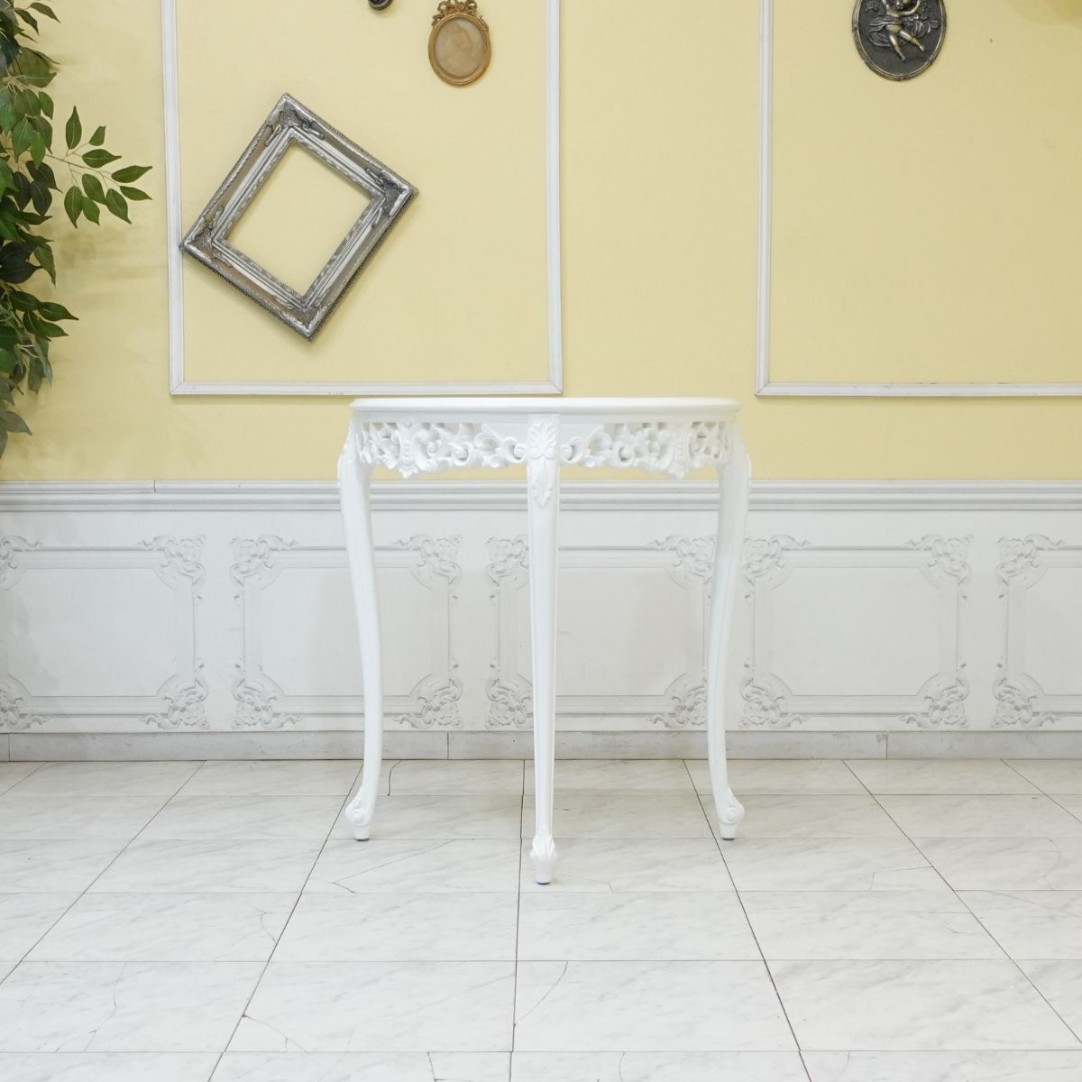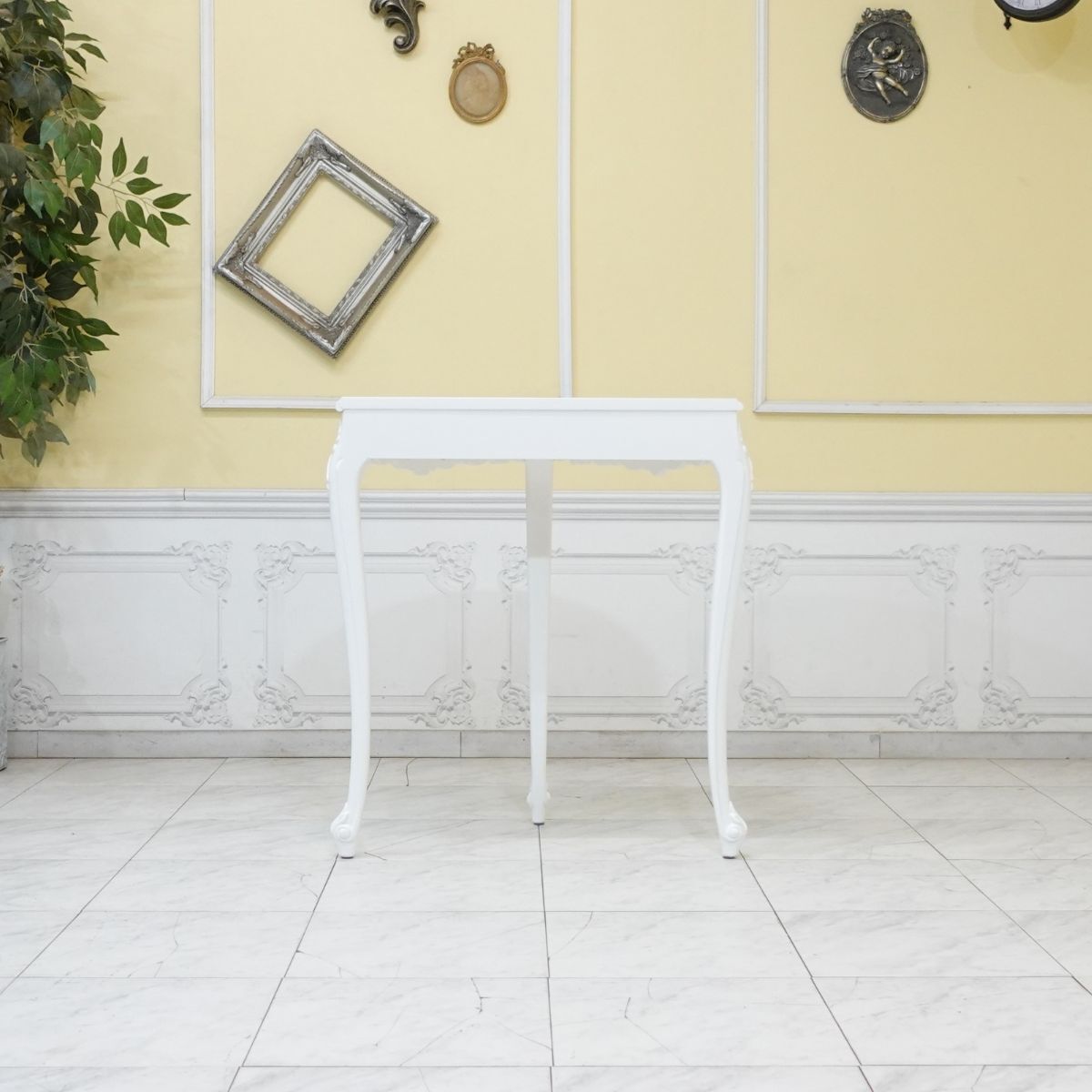 アウトレット コンソールテーブル サイドテーブル 半円 ハーフムーン アンティーク ホワイト 白 z4120-18サイズW 70cm x D 35cm x H 75cmコメント店舗什器としても活躍してくれる小ぶりな半円コンソールテーブル。アウトレット理由・輸入時に生じた右天板凹み