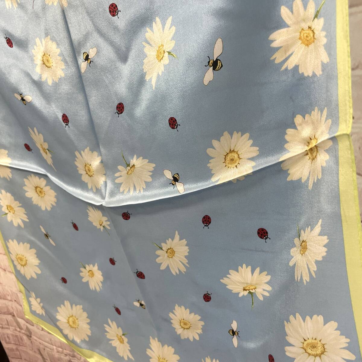talbots タルボット スカーフ バンダナ 花柄 フラワー マーガレット テントウムシ 蜂 ライトブルー 縁ライトグリーン シルク100% 日本製