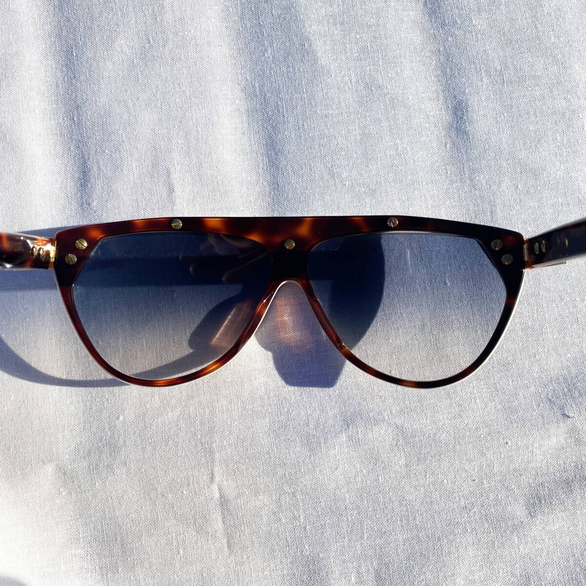 上眉の24Kゴールドメッキメタルのアシンメトリなアップリケが特徴で、グレーのグラデーションレンズは、UV400と機能的にも優れています。