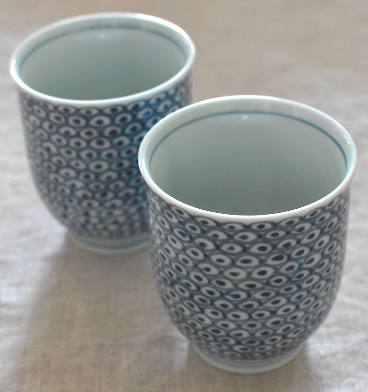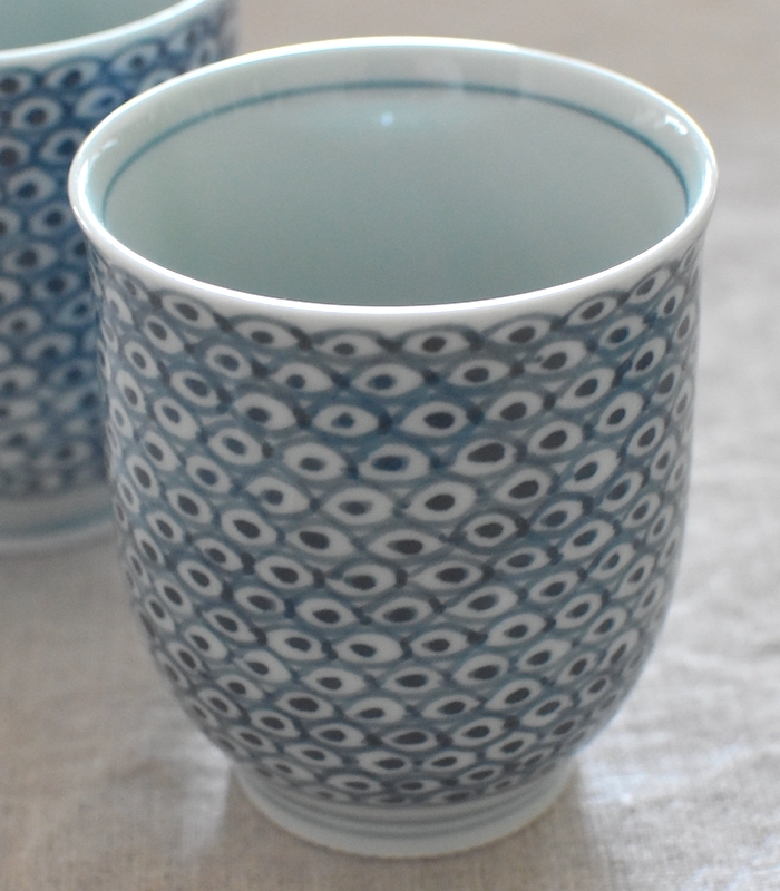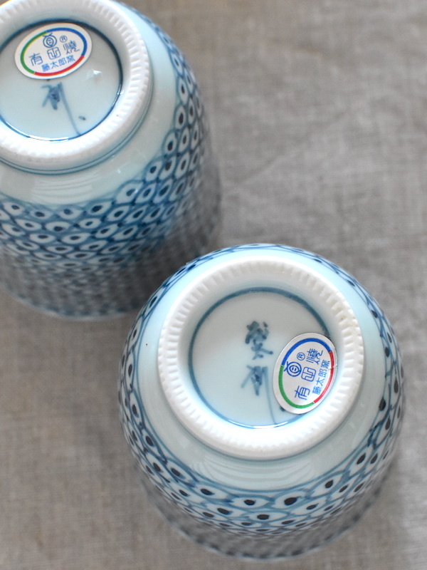 藤太郎窯(金峰藤太郎)のペア湯呑です。呉須と呼ばれる藍色の染料で文様を描く染付けの技法を守る有田焼の窯元で、一つ一つ細かく手描きされた鹿の目文様が魅力の湯呑みです。残念ながらすでに閉窯してしまったそうなので、お探しの方はお手に入るときにどうぞ。