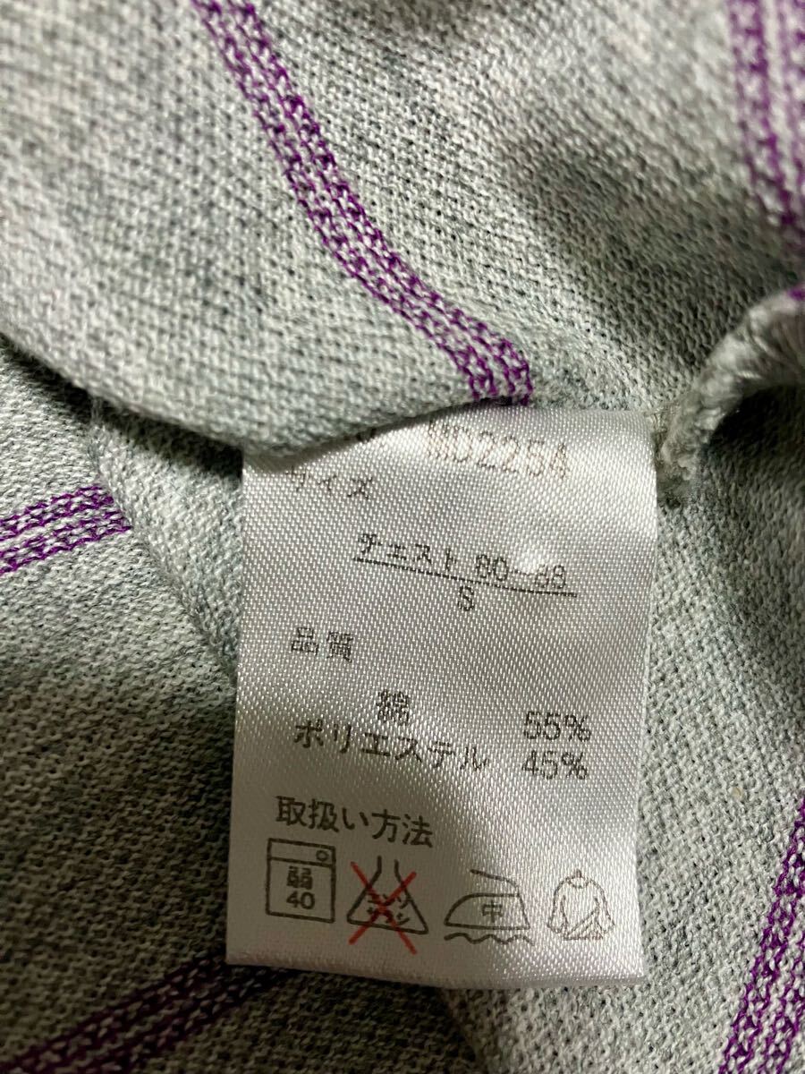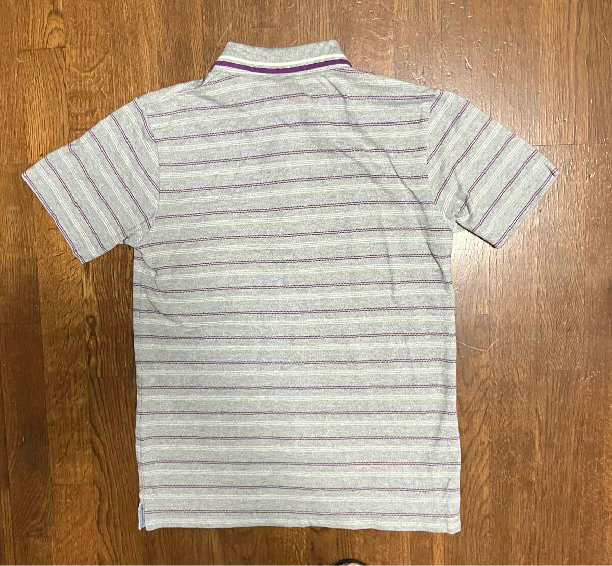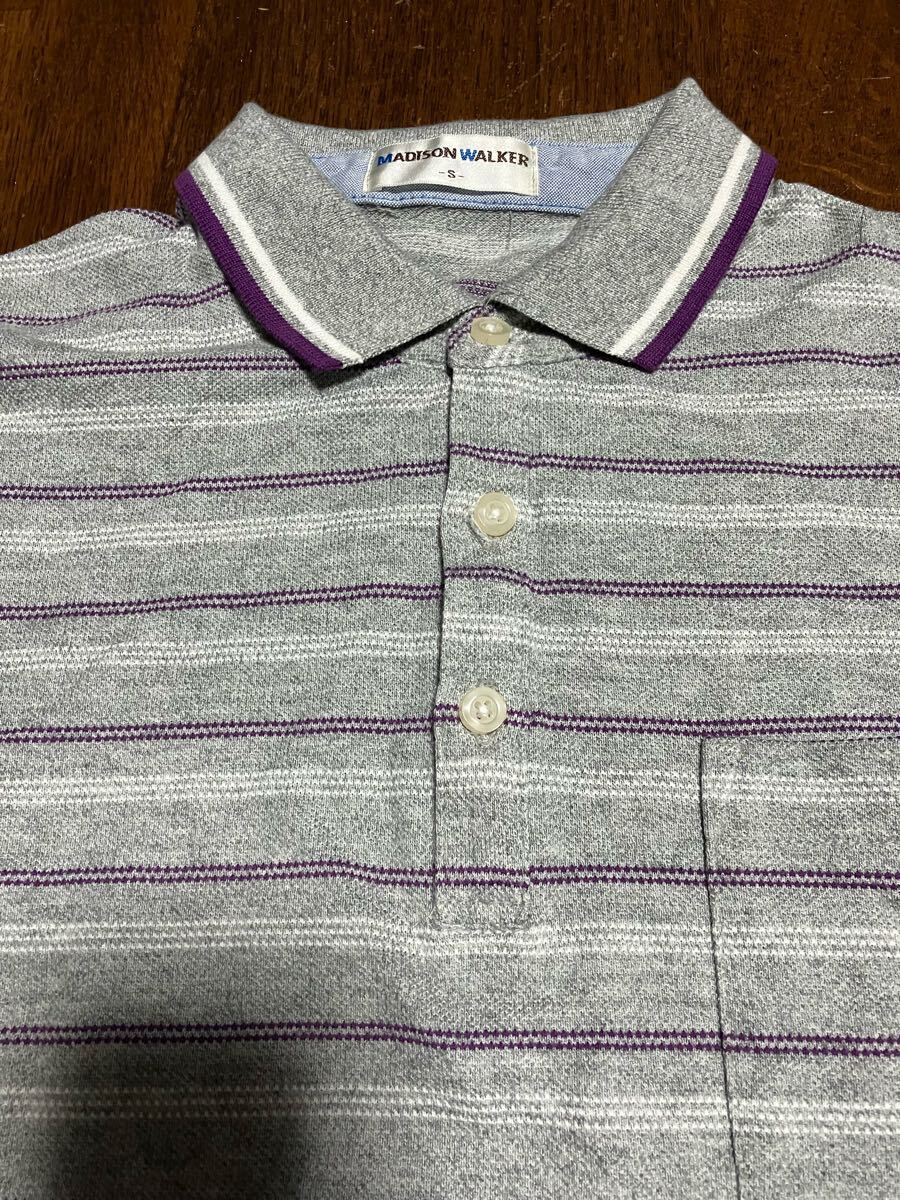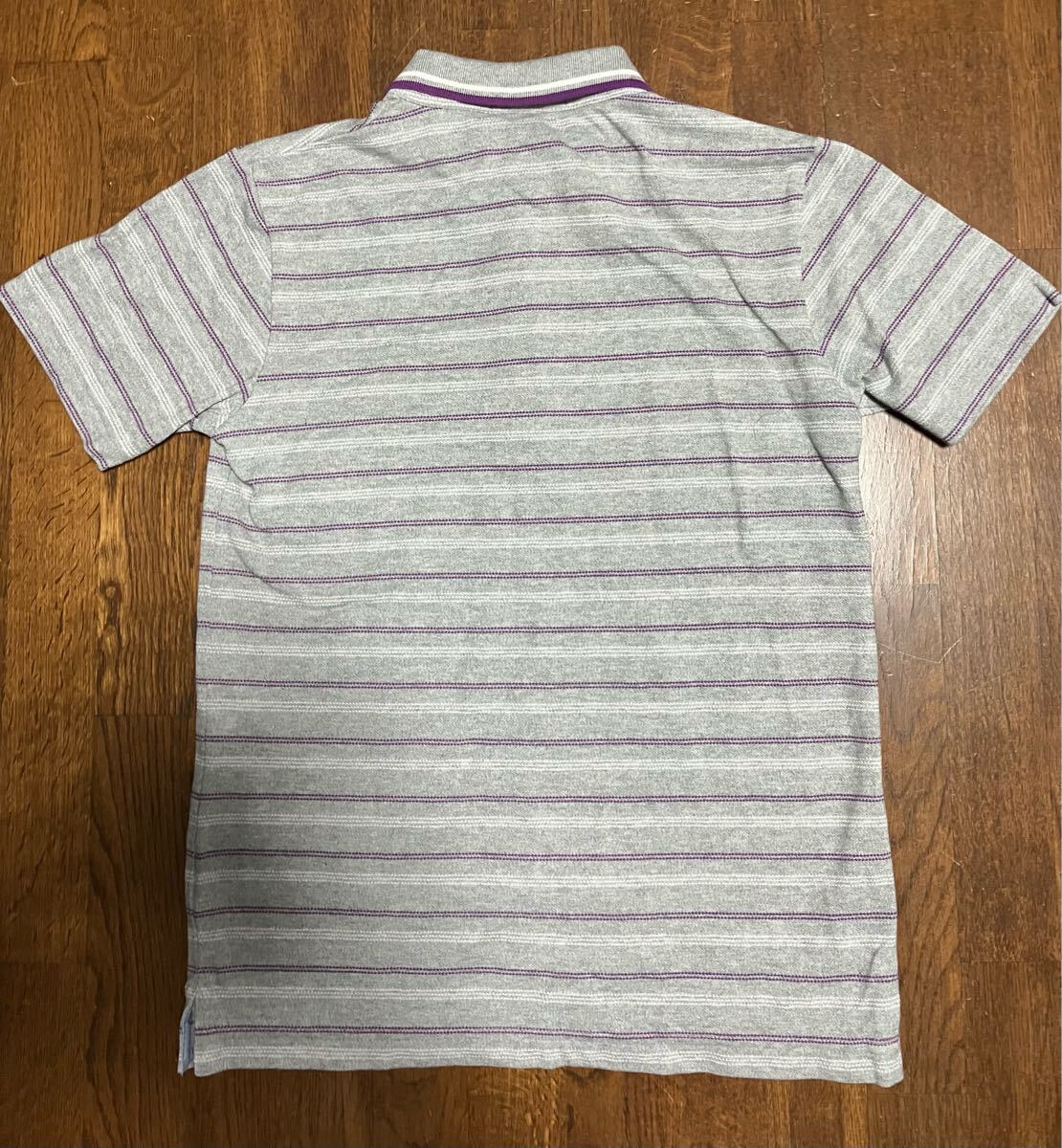 ストライプデザインのグレーとパープルのポロシャツ、サイズS、ポケット付き。