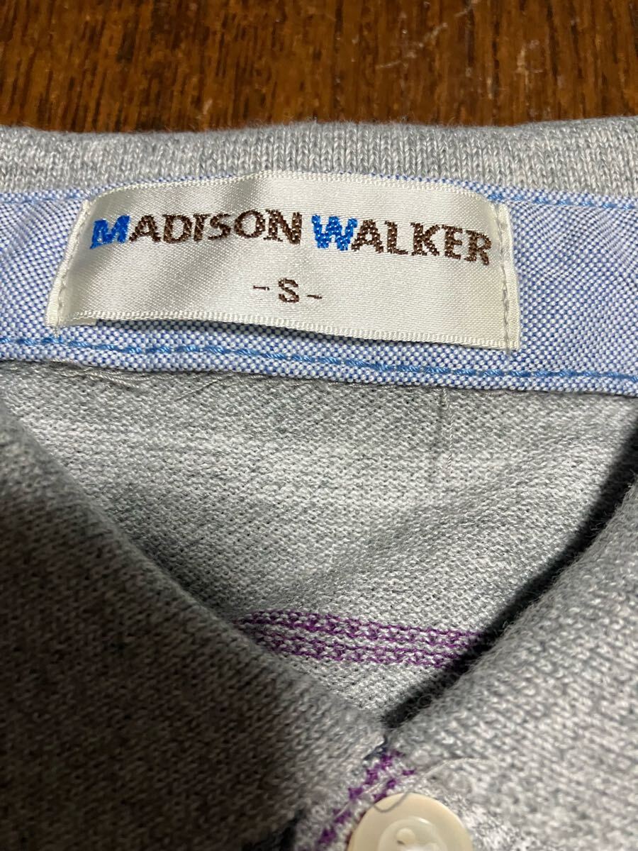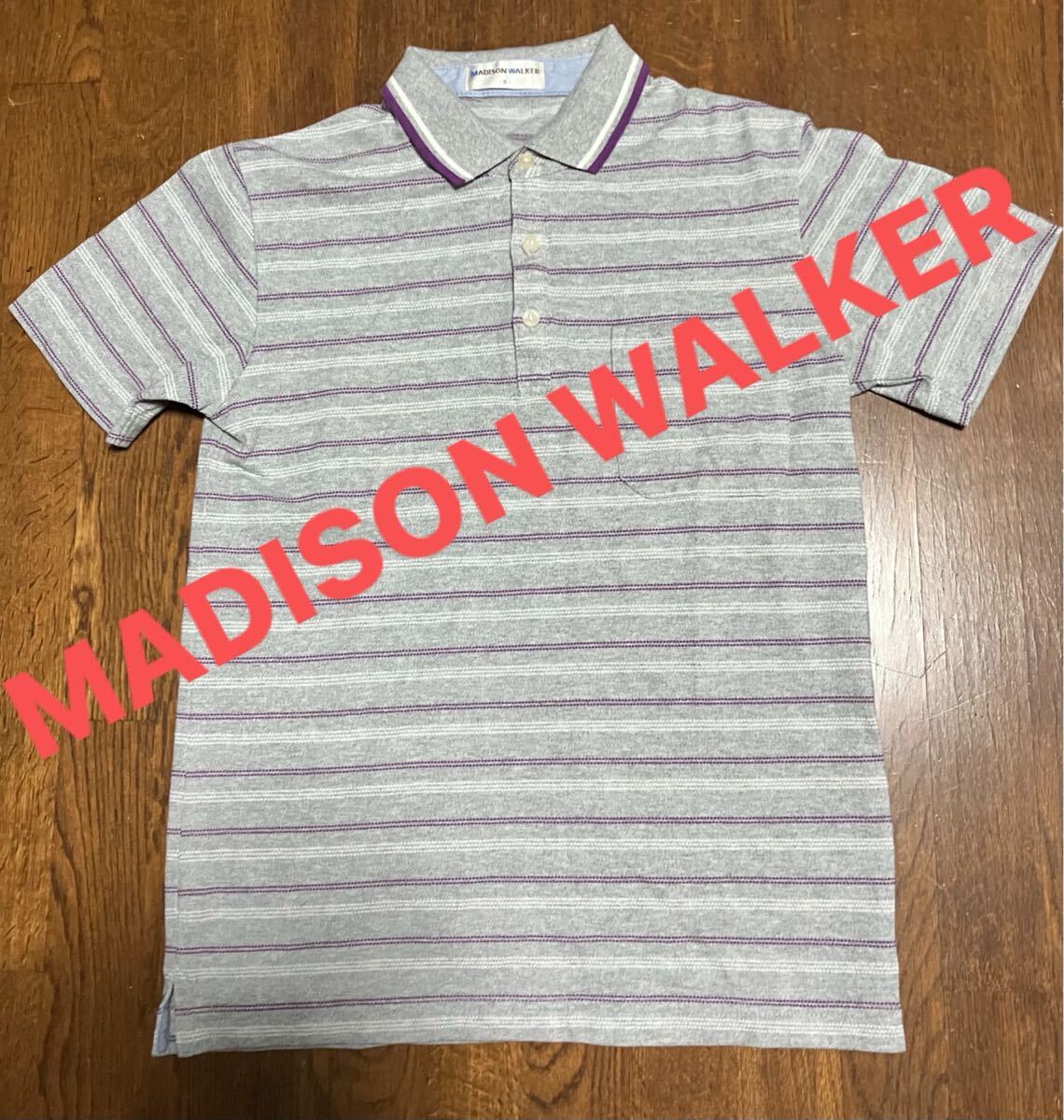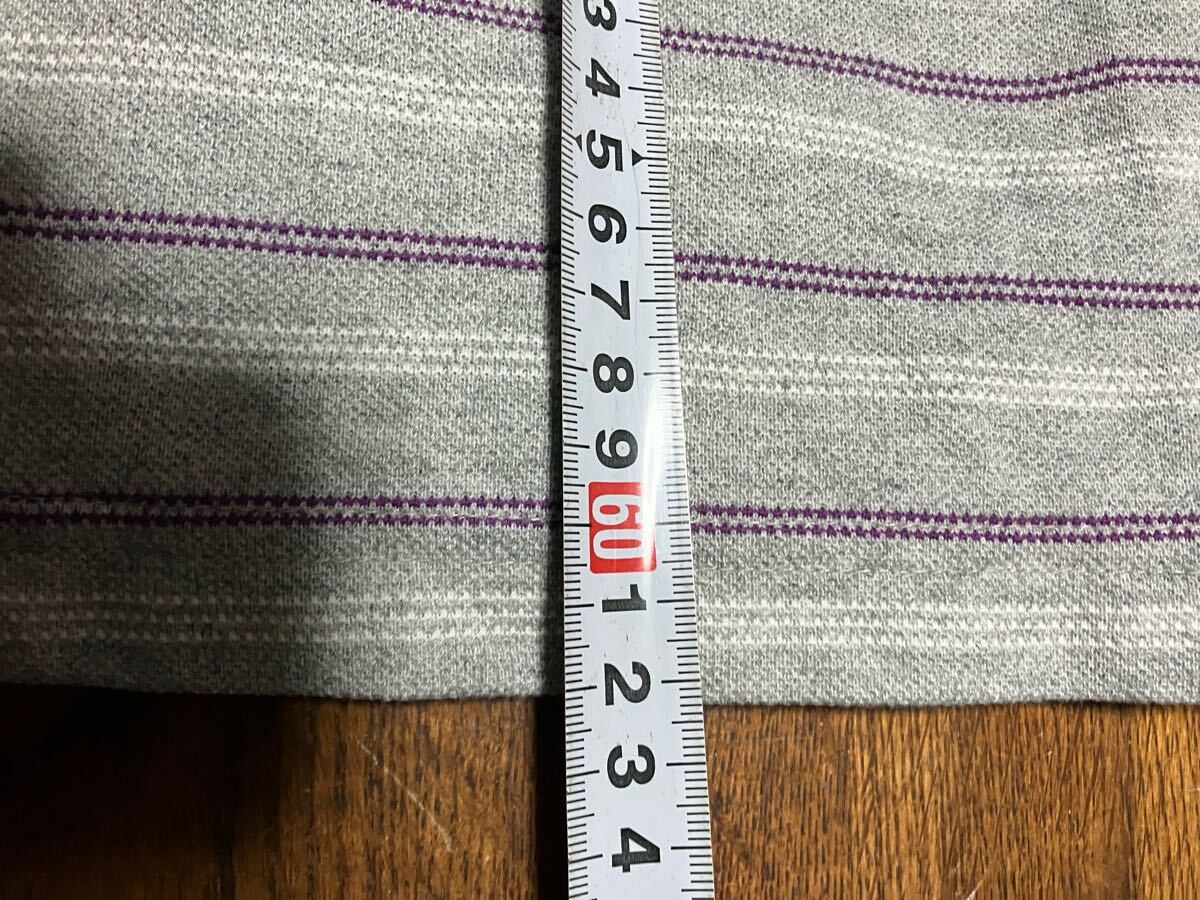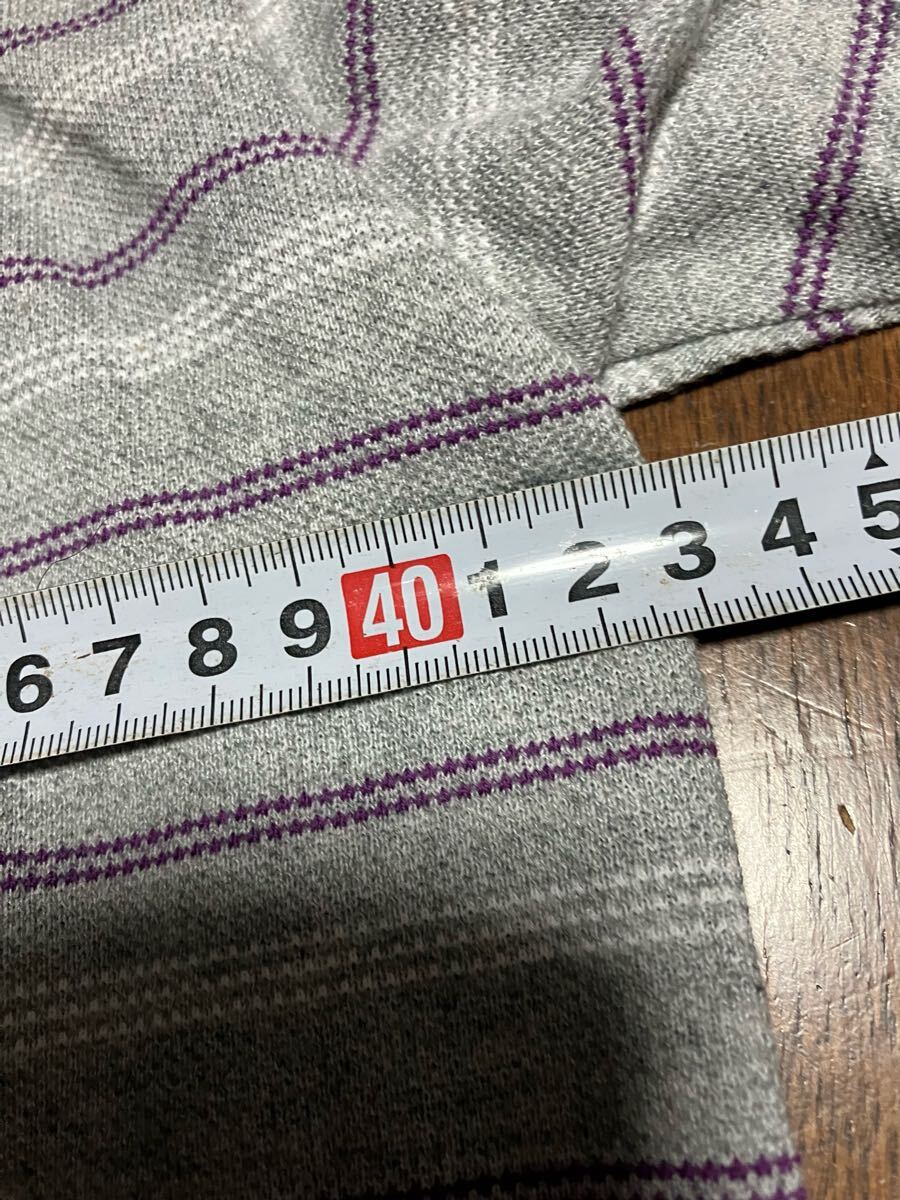 ストライプデザインのグレーとパープルのポロシャツ、サイズS、ポケット付き。